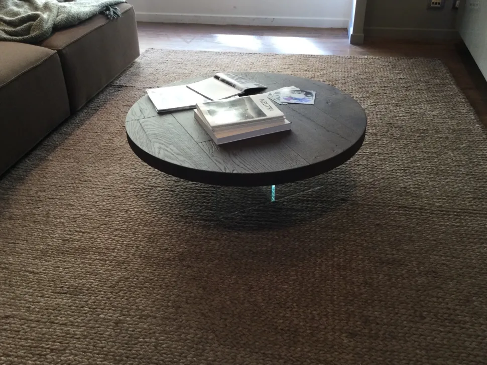 Tavolono con piano sp.8 cm in massello di rovere tinto grigio diam. 90 cm H. 28 cm e sostegni in vetro extra chiaro trasparente