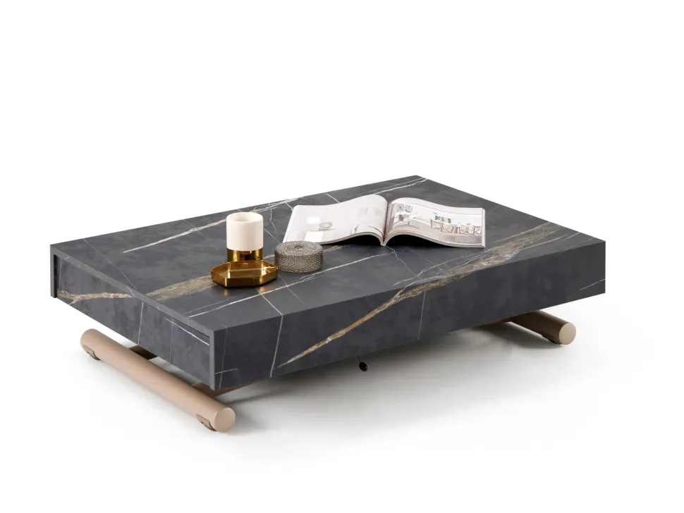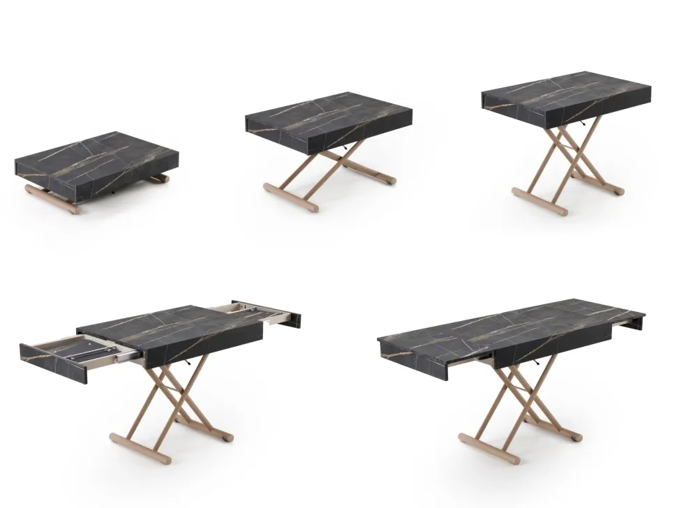 Alexander outlet è un tavolino trasformabile con prolunghe interne, pensato per unire funzionalità ed eleganza. Il suo piano rettangolare allungabile si trasforma con facilità in un vero e proprio tavolo da pranzo, perfetto per accogliere ospiti o rispondere a esigenze improvvise di spazio. Grazie al pratico meccanismo di sollevamento a gas, l’altezza può essere regolata con precisione millimetrica, offrendo la massima versatilità d’uso. Sotto il piano, un sistema in alluminio nasconde con discrezione due prolunghe interne, pronte all’uso quando servono.