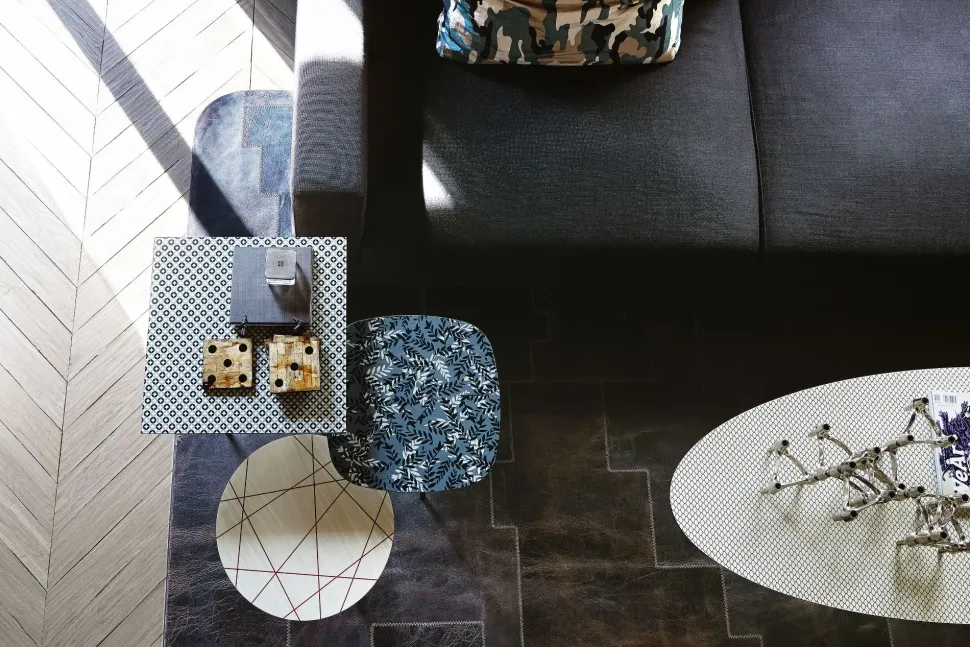 Ogni tavolino presenta un motivo geometrico sul piano, e l’insieme dei quali crea una delicata palette cromatica.