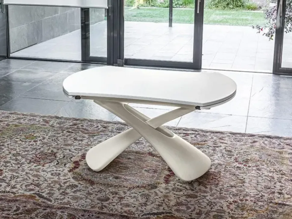 Tavolino trasformabile in tavolo da pranzo, meccanismo a gas, regolabile in altezza al millimetro da cm 41 a cm 80, piano rettangolare irregolare trasformabile in rotondo. Base rivestita in poliuretano rigido verniciato. Ruote a scomparsa.
