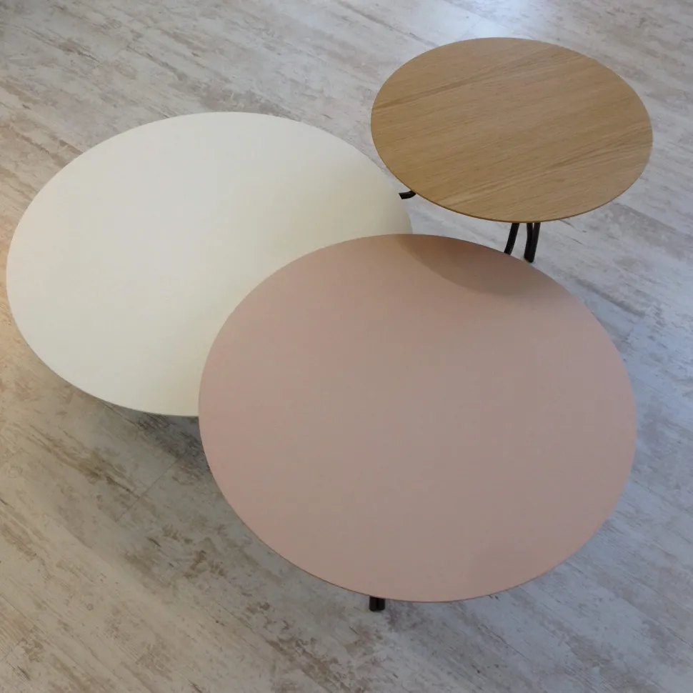 La struttura in metallo verniciato color nero, fa da supporto a tre ripiani dalla forma arrotondata di altezze e misure diverse che conferiscono all’insieme dinamicità e carattere.