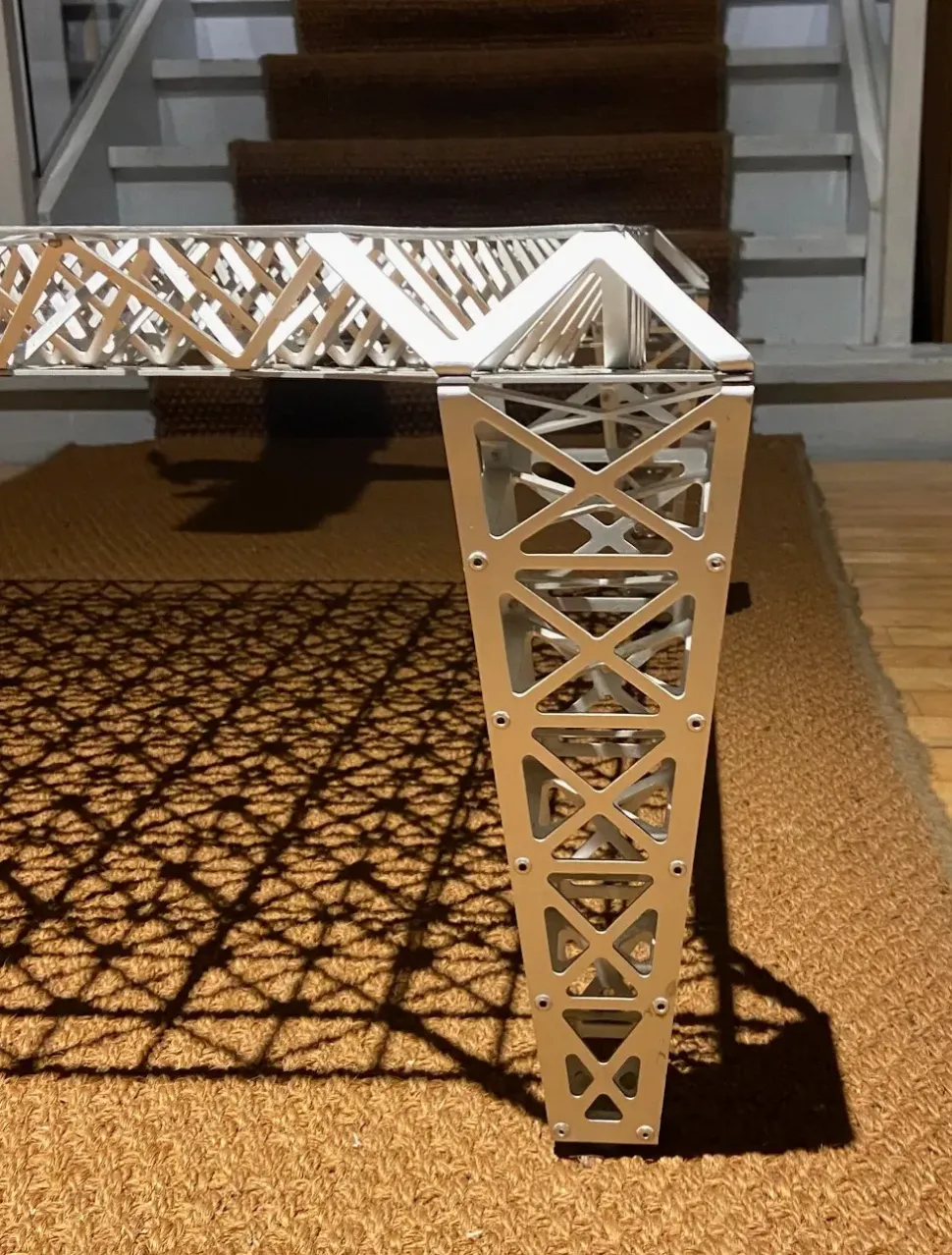 Tavolino in alluminio naturale realizzato da una serie di triangolazioni con membrane strutturali ottenute da 3 fogli di alluminio di 2 mm di spessore, tagliati, piegati e vincolati meccanicamente.