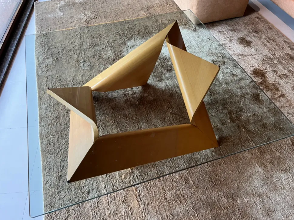 Tavolino da salotto cm 105 x 105 in legno curvato impiallacciato noce biondo , con piano in vetro temperato