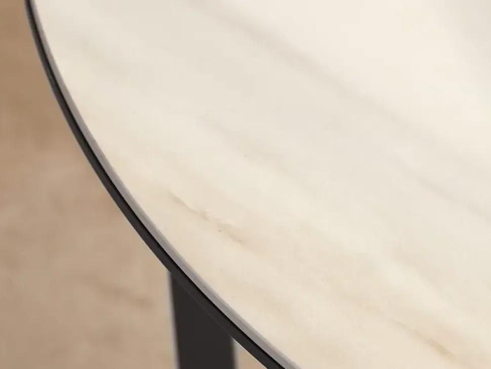 Tavolino con base in metallo verniciato a polvere, ripiano inferiore portaoggetti in tinta. Piano in ceramica spessore 3 mm su pannello.