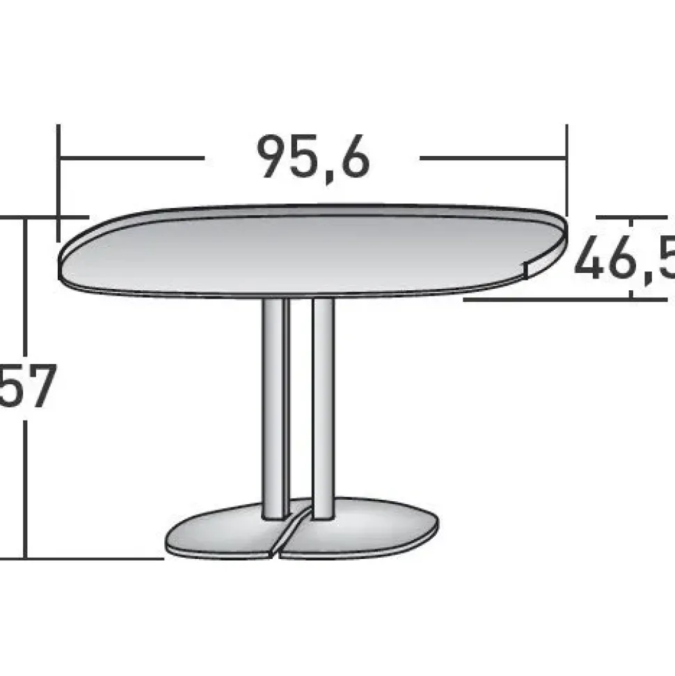 Tavolino leggero e minimale, realizzato in metallo con finiture Anodic Bronze, Bianco, Brunito opaco, Nero e Greige. Il piano dalla forma ovale è sorretto da due esili gambe centrali o da un unica gamba decentrata, rendendo questa versione facilmente accostabile a un letto o a un divano. La stabilità è assicurata da un basamento in legno verniciato come la struttura. Il profilo rialzato del piano agevola il contenimento degli oggetti.