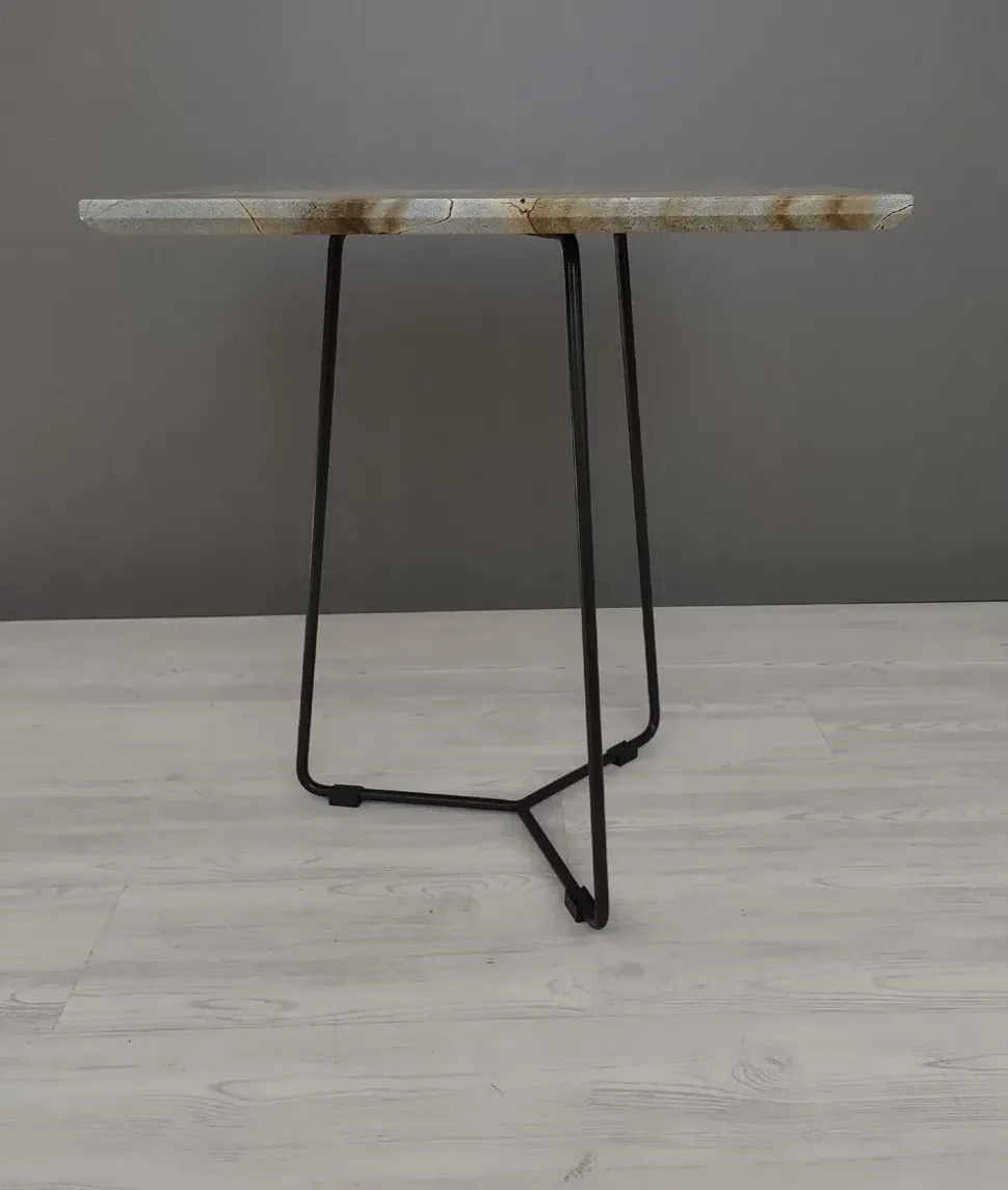 Tavolino quadrato mod. Kevin della ditta Ditre Italia con piano in marmo Spiderman e basamento in metallo verniciato antracite.