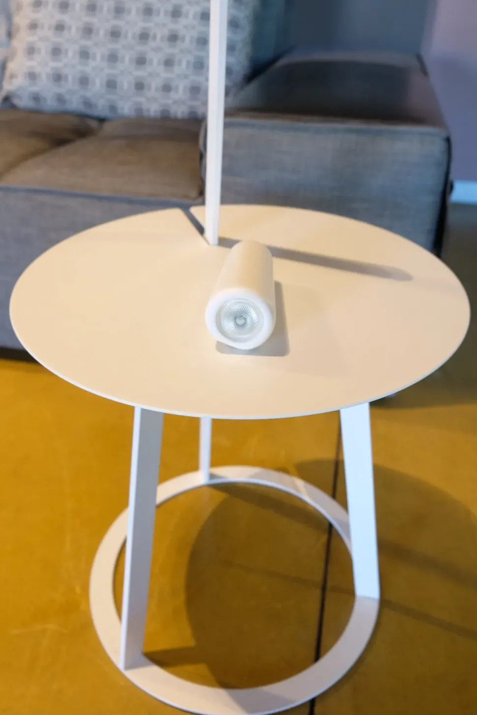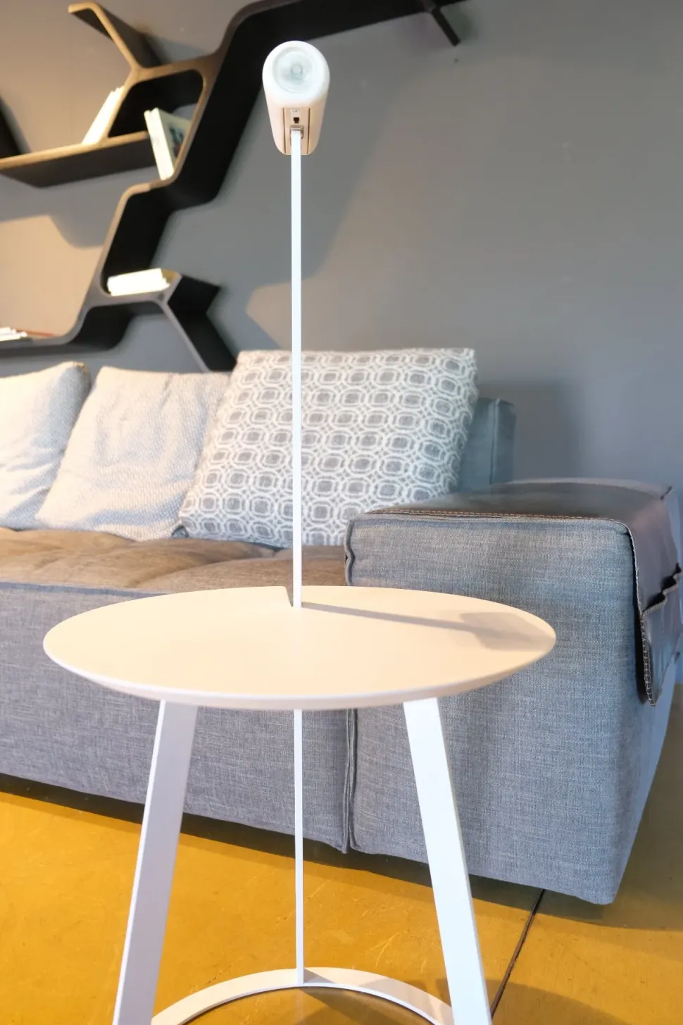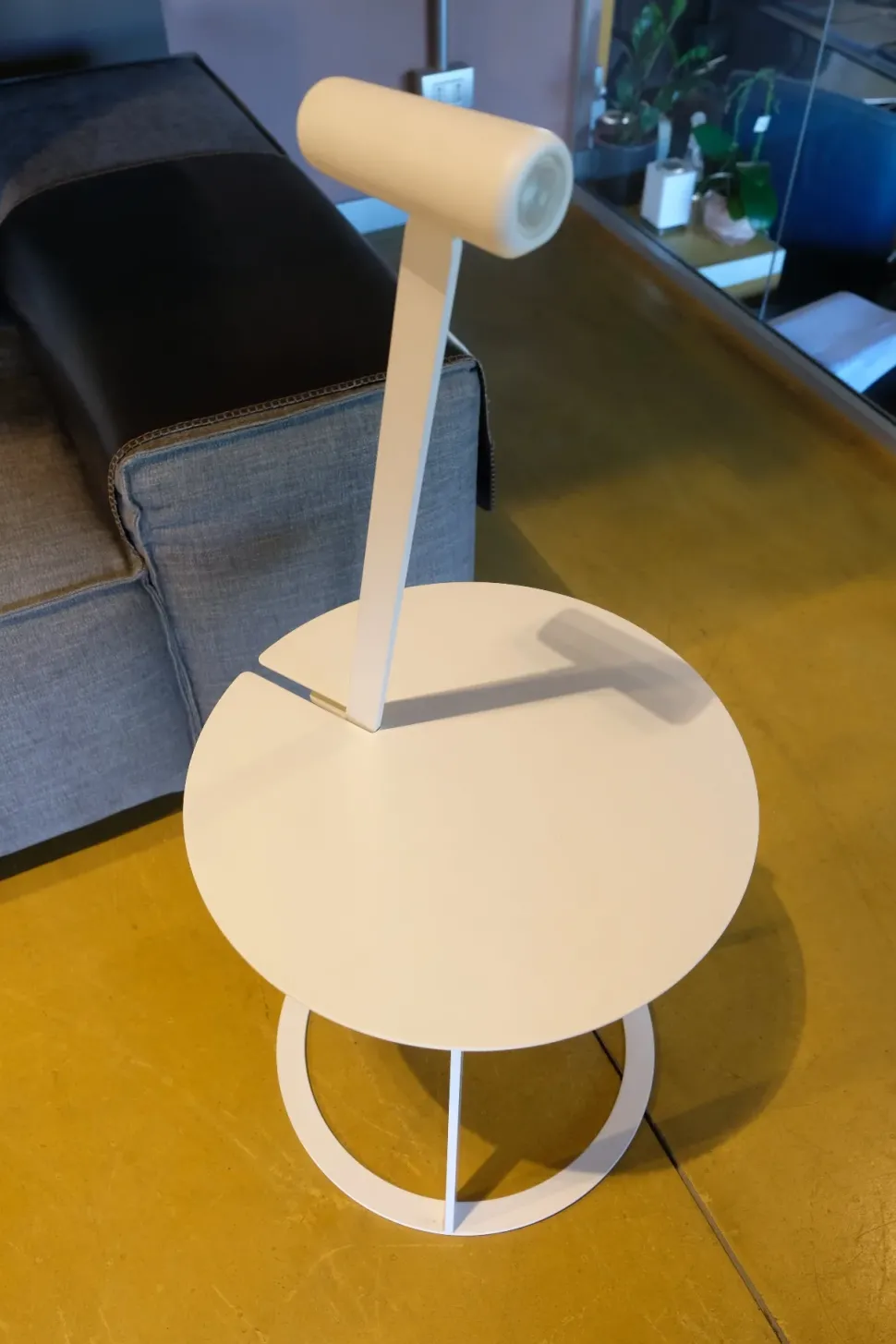 Il tavolino Horm Albino è costituito da una struttura metallica vernicata (le tre gambe), un piano d’appoggio e una torcia LED, alimentabile a batterie o a corrente e posizionabile liberamente sul piano tramite una calamita.