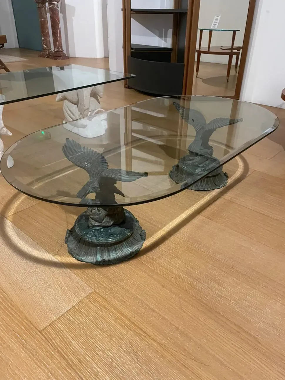 - Quali sono i punti di forza di questo tavolino?I principali punti di forza sono il basamento artistico con aquile in bronzo, il piano in cristallo e le dimensioni versatili. Un complemento d’arredo che unisce estetica e funzionalità.