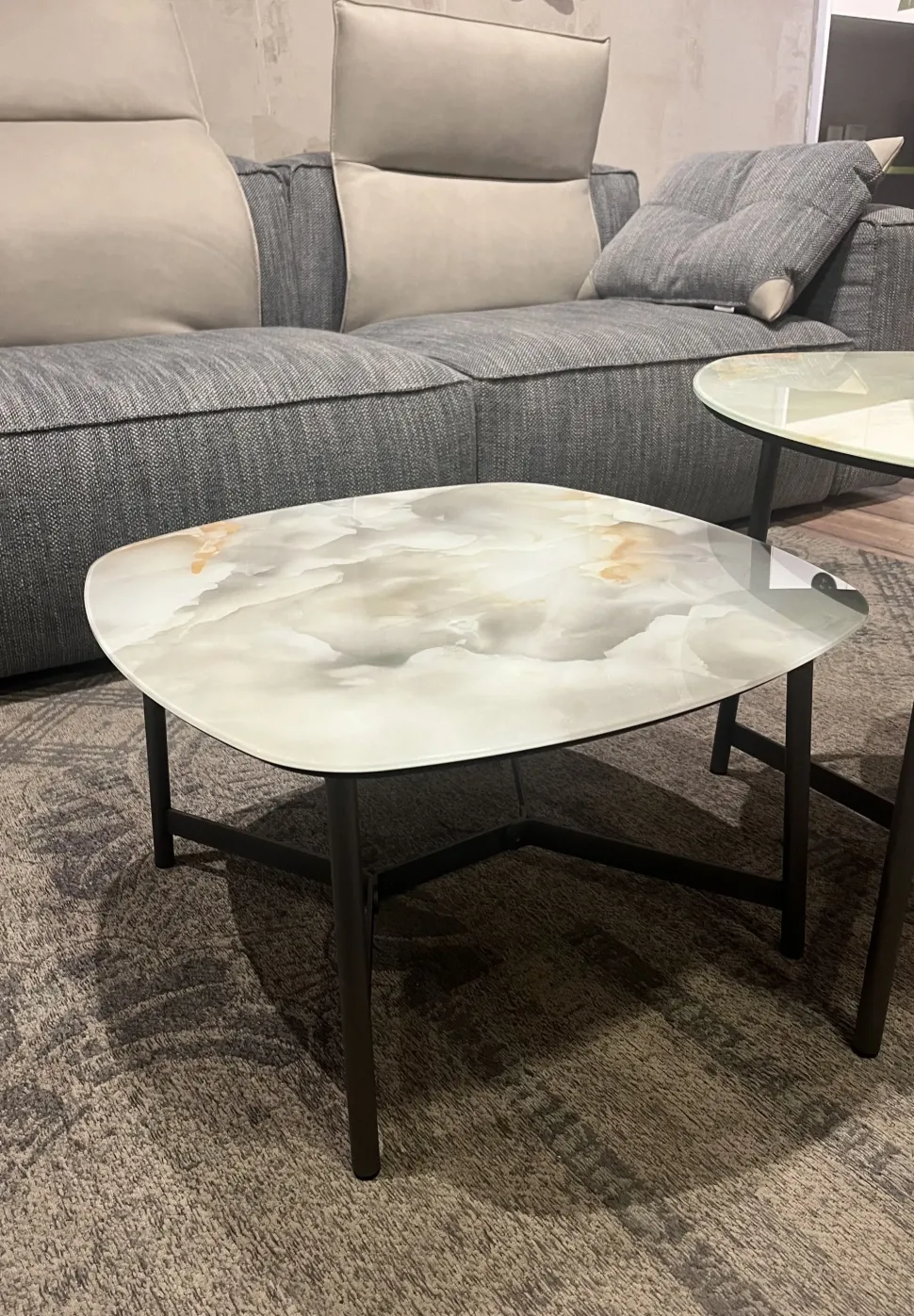 Tavolino modello Tavolino quadrato con angoli stondati di Maconi. Piano in vetro-marmo finitura grigio con effetti sul tono del bianco e bronzo nella dimensione 59 cm e struttura in metallo verniciato antracite opaco. Prodotto alto 35 cm e largo 59 cm.