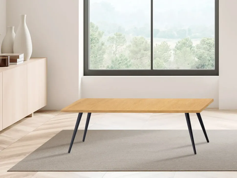 TAVOLINO : essenziale nelle sue forme, ma dal carattere forte come il materiale con cui è costruito: il Legno Massiccio. Il tavolino rettangolare, è un complemento che ben si adatta a tutti i tipi di arredo ed ambiente living. Adatto ad una collocazione sia fronte che lato divano, o per la sala d attesa di uno studio. Il tavolino ha una struttura in metallo: si regge su quattro robuste gambe coniche, verniciate nelle colorazioni nero opaco.Il piano è in legno massello con profilo squadrato e si fonde con il metallo per creare un gioco armonioso di linee e materia.