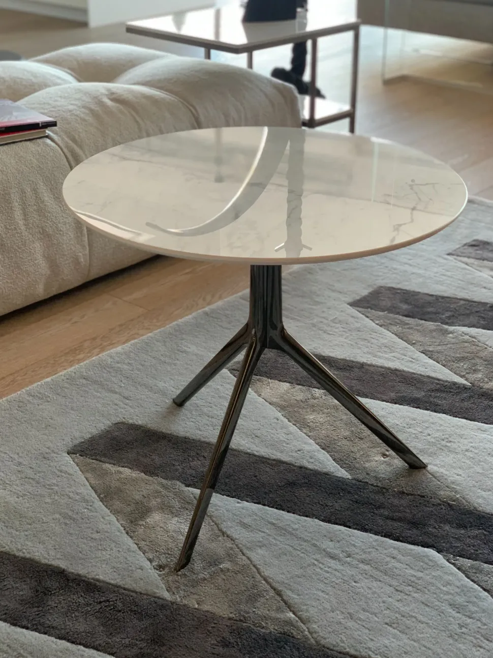 Questo modello è adatto a diversi ambienti, sia nella zona giorno, come tavolino da soggiorno affiancato al divano, che negli ambienti notte, come comodino; completa la composizione come elemento di grande eleganza, grazie al piano in superceramica effetto marmo lucido che dona un tocco chic e di luce. Le linee semplici e armoniose, organiche, caratterizzano le bellissime gambe con sezione triangola, che armoniosamente si uniscono centralmente, a formare il basamento.