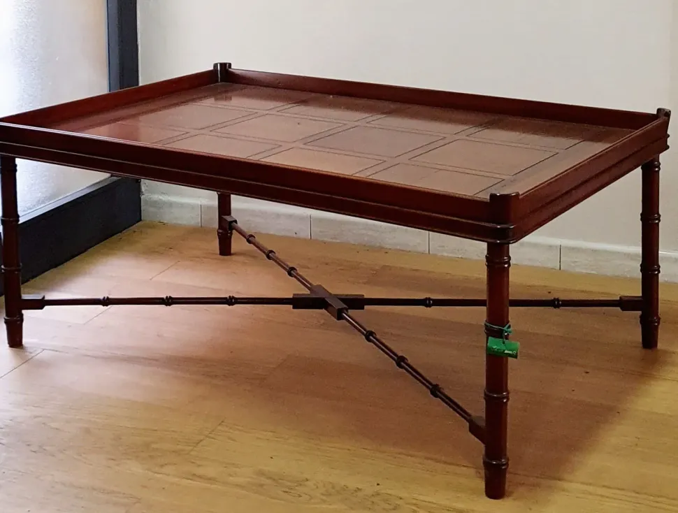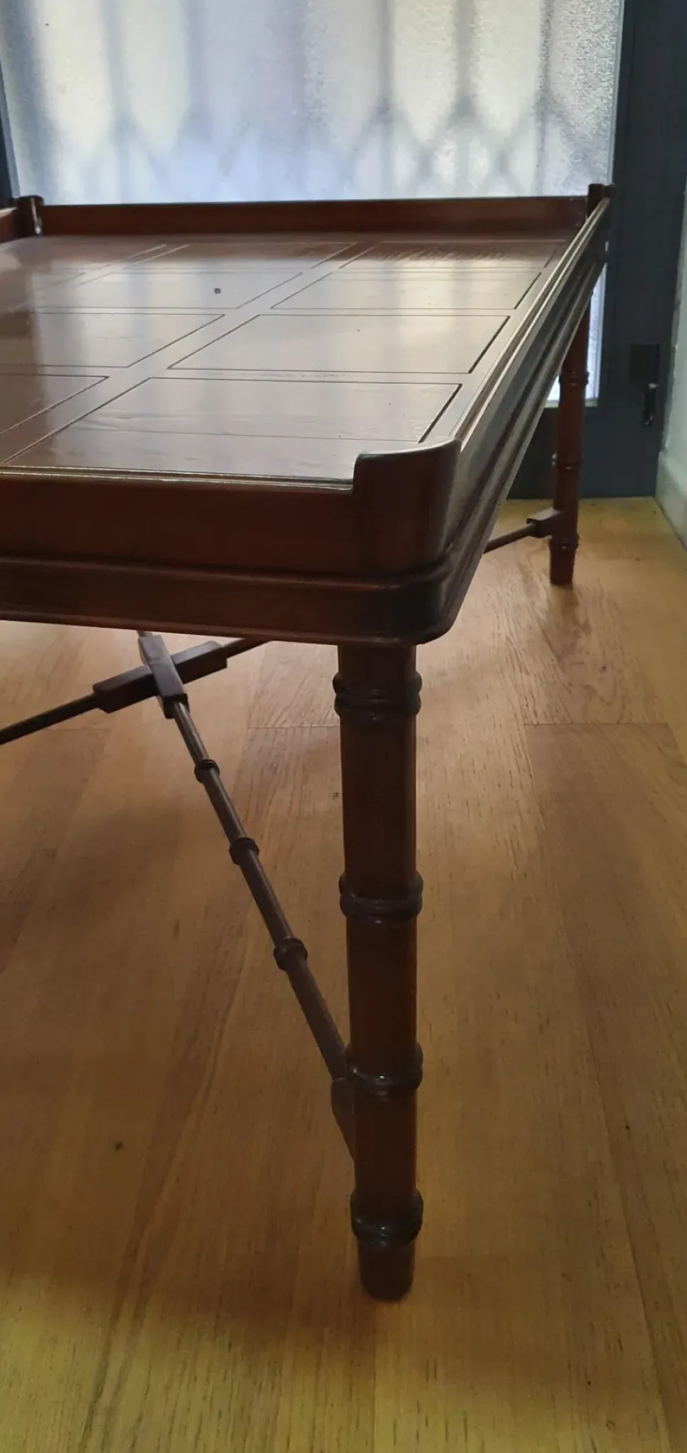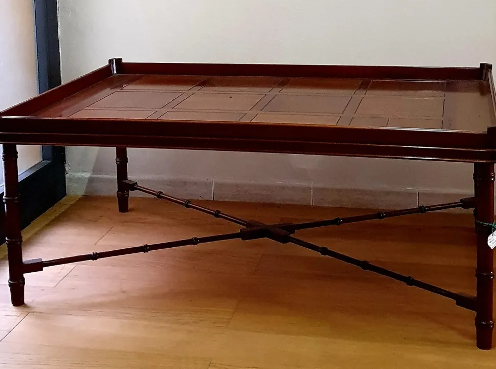 Tavolino da salotto dalla particolare forma a vassoio, realizzato in ciliegio e con la particolarità del piano superiore realizzato con effetto parquet , dove le lastre sono incrociate in modo perpendicolare. Le gambe riprendono lo stilema del giunco e sono irrobustite da una crociera a x. Il tavolino misura cm 120x80x47h ed è finito con una tinta a base acqua e una finitura a cera che gli conferisce una nota di colore molto caldo. Come per tutti i nostri mobili, l’imballo è omaggio ed il trasporto escluso, se richiesto, ci appoggiamo e lo preventiviamo solo con corrieri a noi abituali e specializzati in trasporto mobili.