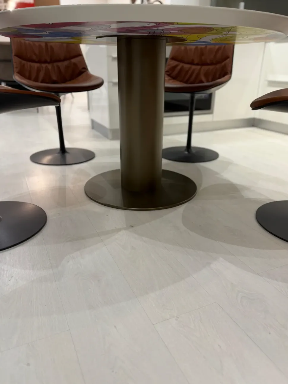 Il tavolo 63° di De Rosso: piano rotondo in laminato HPL, basamento centrale. In offerta outlet con sconto.