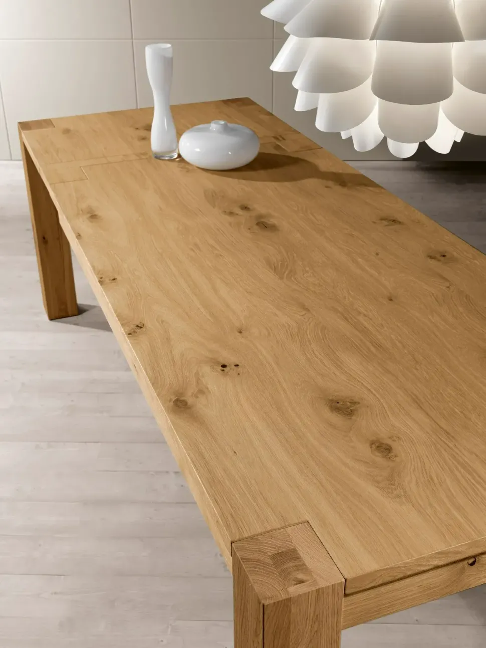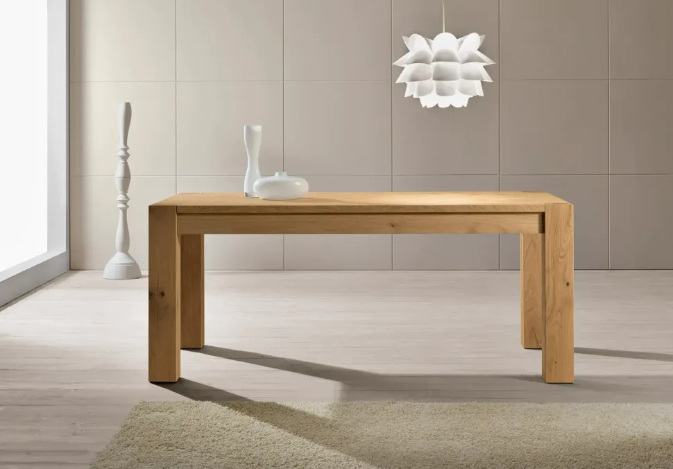 Tavolo allungabile in rovere. Gambe quadrotto massello con crepe e nodi o lamellare.