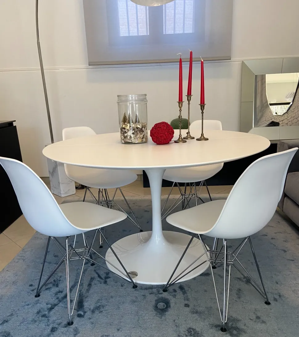 Inoltre, è disponibile anche una versione rotonda del Tavolo Tulip Sigerico, ideale per ambienti di molteplici misure. La lunghezza di questo modello può variare da 161 a 190 cm.