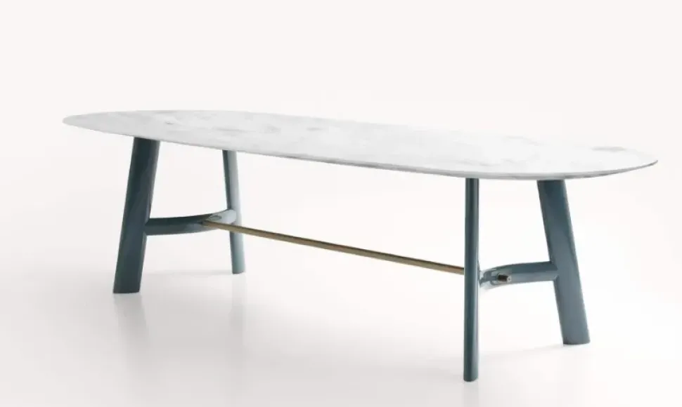 l tavolo August disegnato da Roberto Lazzeroni per Lema, ricorda seppur nella sua apparente semplicità lo stile dei tavoli a cavalletto. Il piano, disponibile in diverse dimensioni e in una varietà di materiali tra cui marmi ed essenze, è alleggerito da uno spessore sottile. I cavalletti di appoggio sono uniti tra loro da un elemento metallico finitura bronzo patinato.