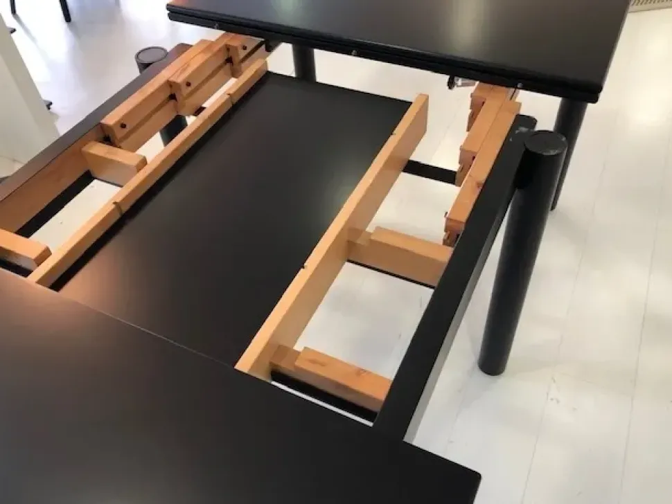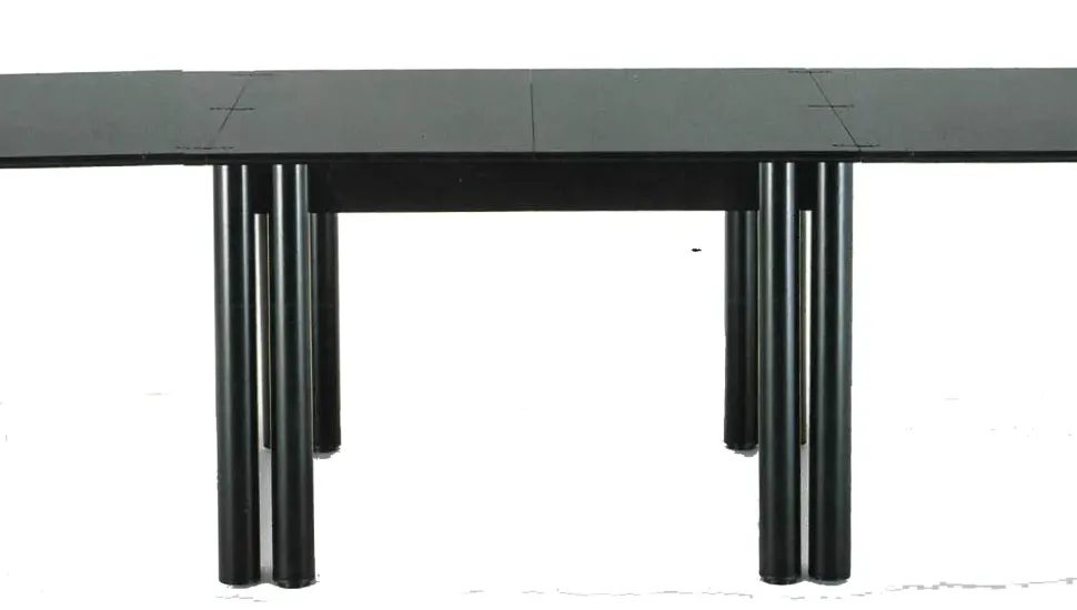 Tavolo laccato con prolunghe laccate nere contenute all’interno.