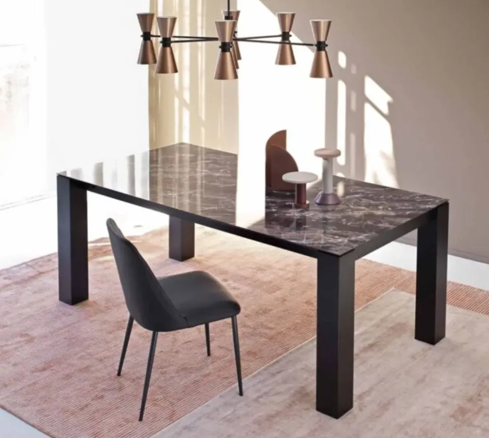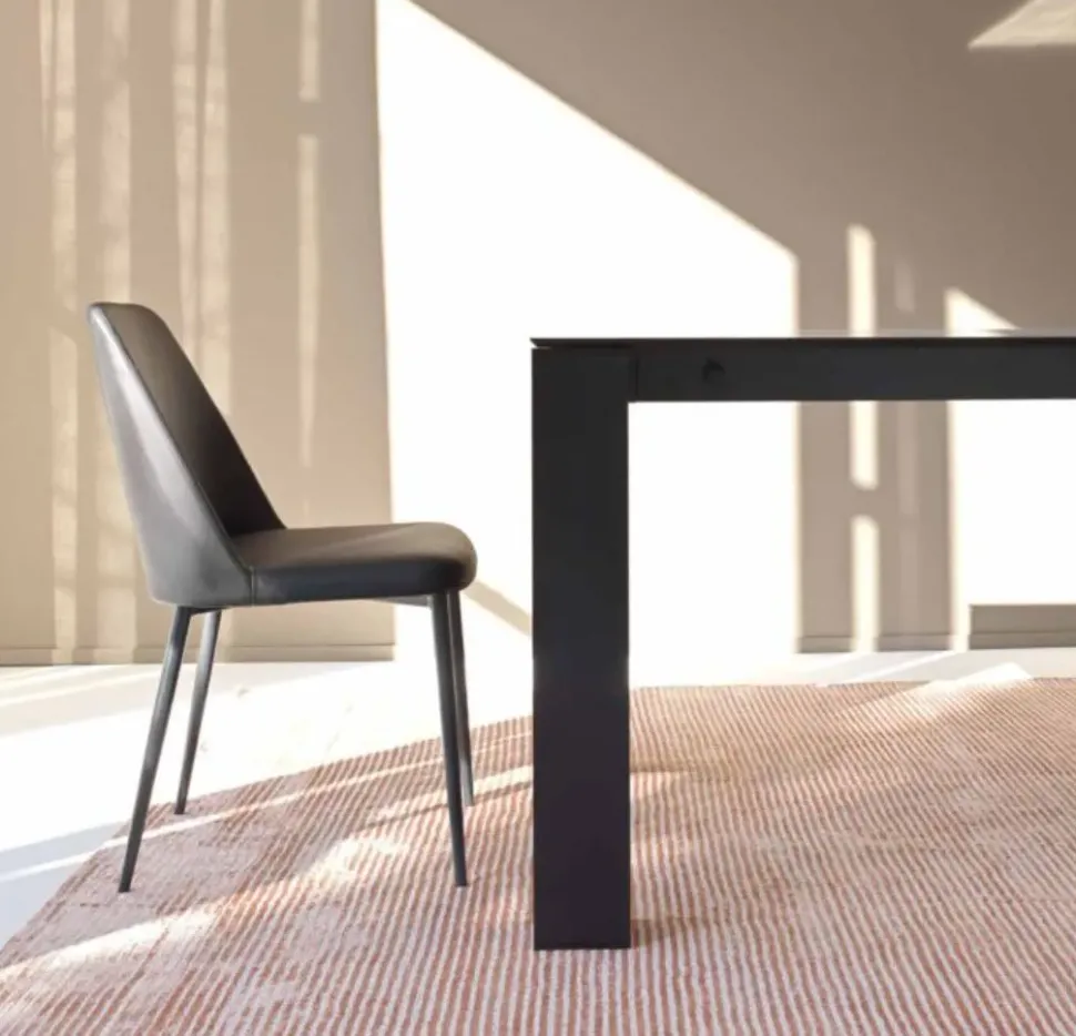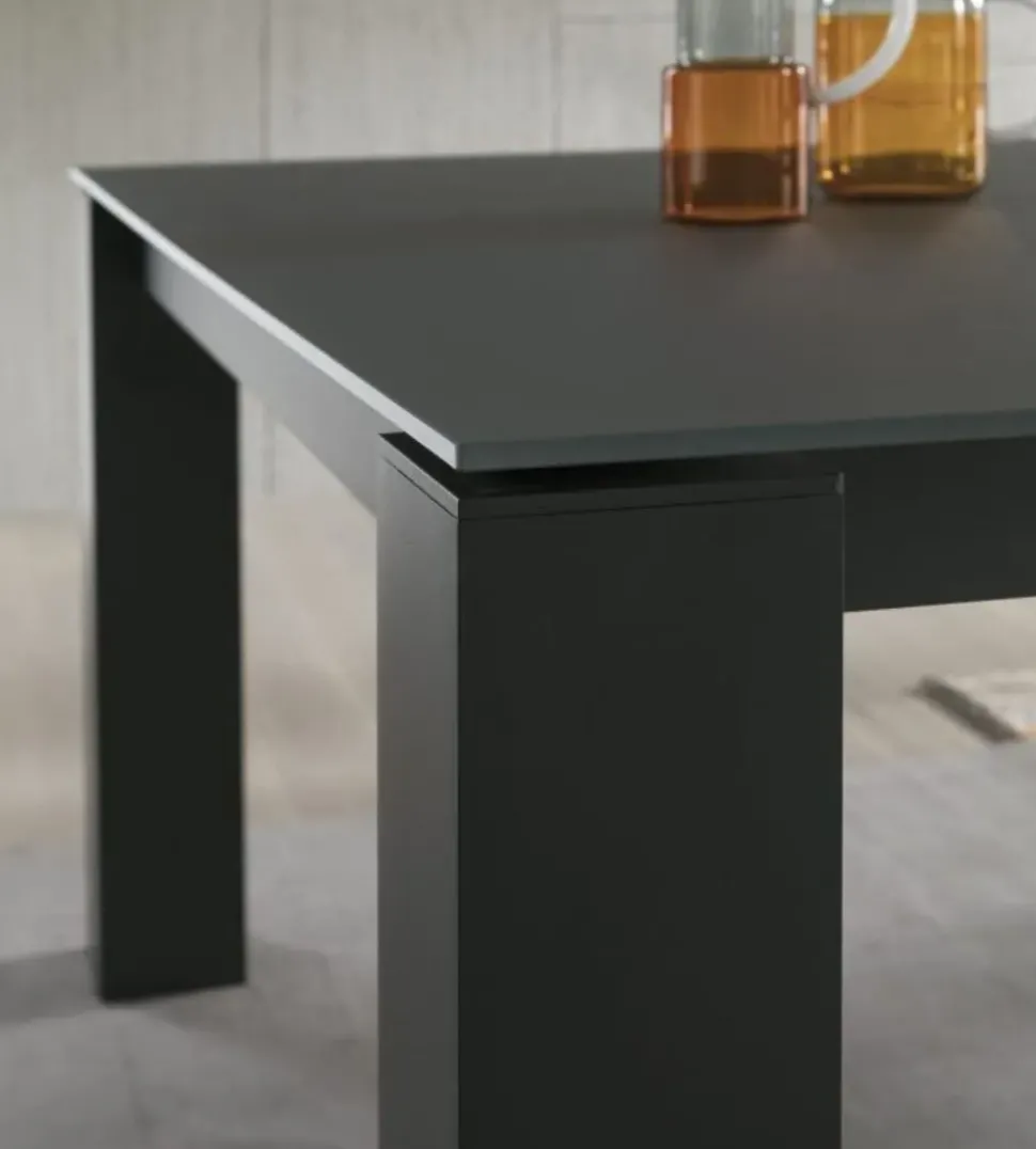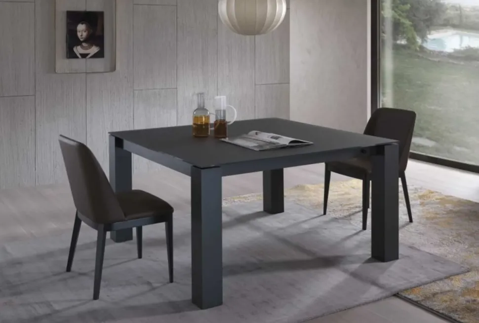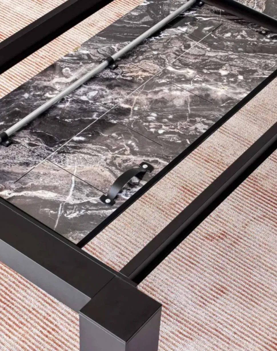 Tavolo 160×90 allungabile a 240 cm con struttura in alluminio verniciato opaco disponibile in 4 colorazioni ( bianco, bronzo, antracite e nero) e top laminato materico disponibile in diverse finiture come HPL, ceramica, legno.
