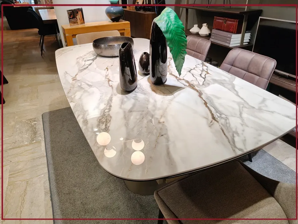 TWINS CS4153-S 200 di Calligaris è un tavolo allungabile dal design elegante e scultoreo, perfetto per ambienti contemporanei che non rinunciano al carattere. Il piano e le allunghe in ceramica-vetro nella pregiata finitura Calacatta Paonazzo lucido catturano lo sguardo con le loro venature decise e sofisticate, regalando profondità e luminosità alla superficie.