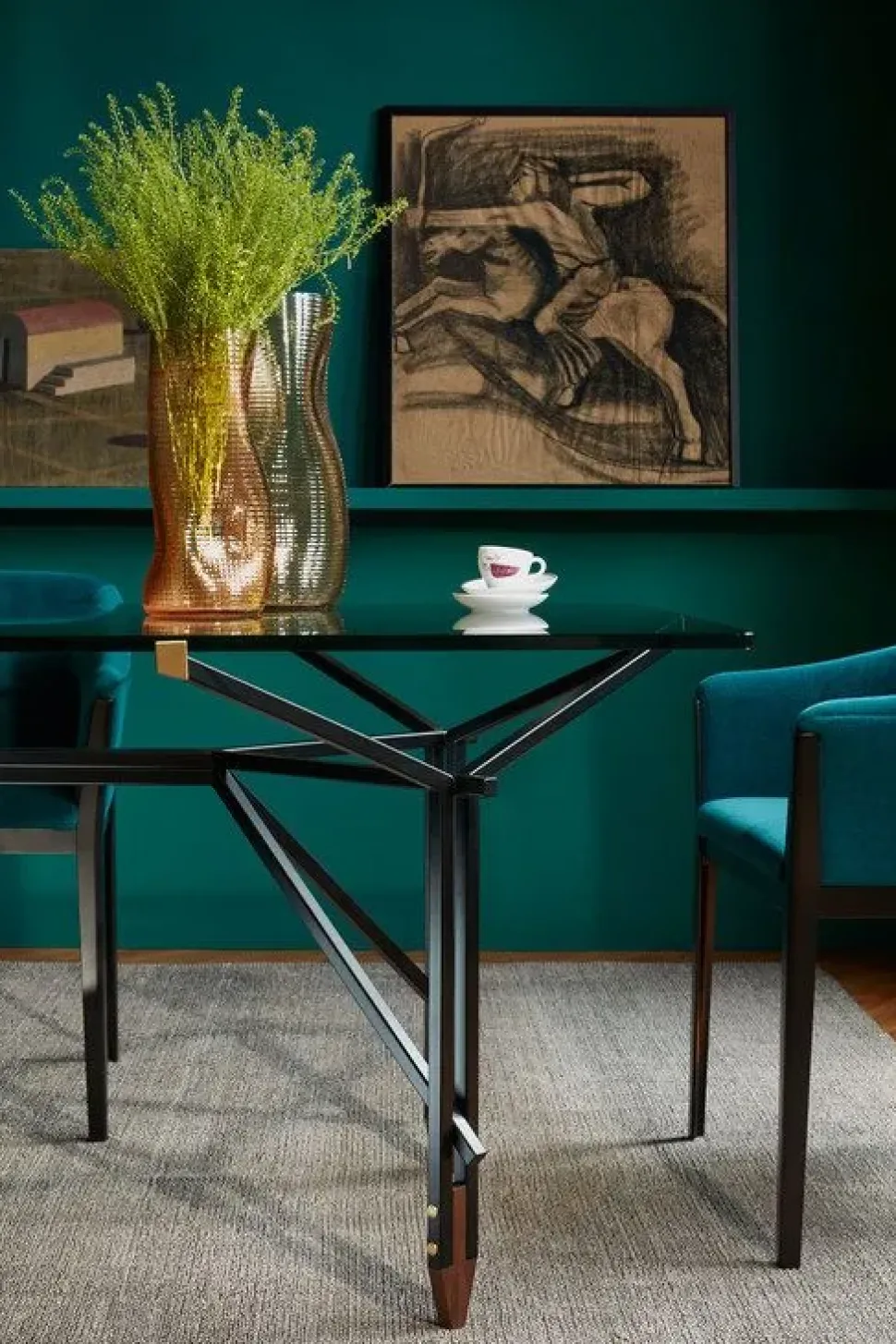 Grosse viti in ottone impreziosiscono l’architettura del tavolo definendo l’unicità di questo arredo moderno audace e magnetico, che riecheggia gli stilemi tipici degli anni ’50.