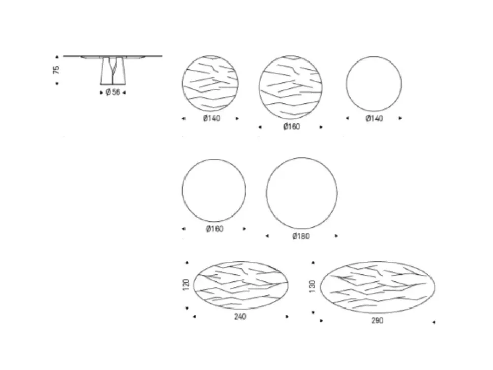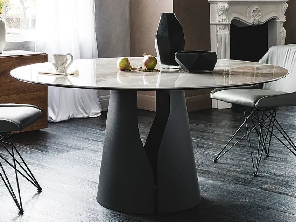 - Una struttura con basamento centrale ultima il valore estetico del tavolo Rotondo qui presente, che si confermerà in questo modo presenza caratterizzante del soggiorno o della zona cucina dove sarà collocato, grazie alla sua figura dall’estetica raffinata.