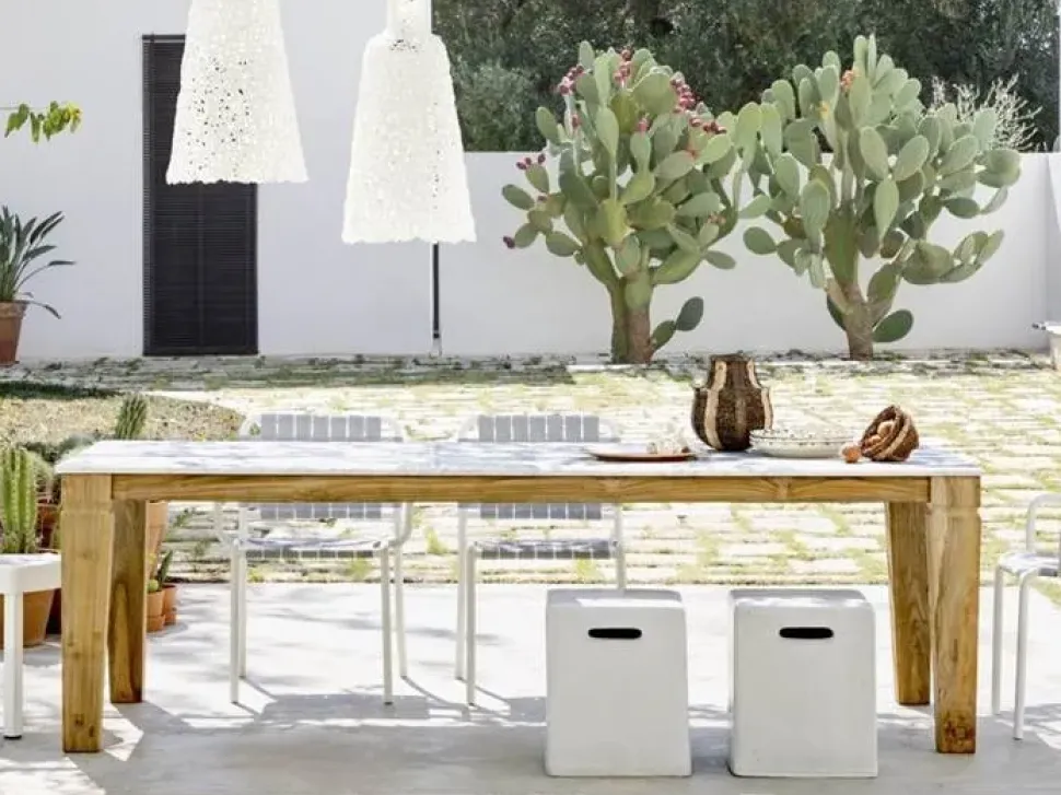 Tavolo modello Jeko 33 della nuova collezione Outdoor di Gervasoni dallo stile esotico. Le gambe e la struttura di questo modello sono in ECOTeak, pregiato legno proposto dal rinomato brand, che si presta particolarmente all’ambiente esterno grazie alle caratteristiche estetiche e fisiche di impermeabilità e resistenza agli agenti atmosferici, umidità e salsedine. Forme sinuose e una texture materica contraddistinguono il teak di questo modello, che proviene dal riutilizzo controllato ed autorizzato di elementi dello stesso materiale recuperati dalle tradizionali case in legno dell’isola di Java.
