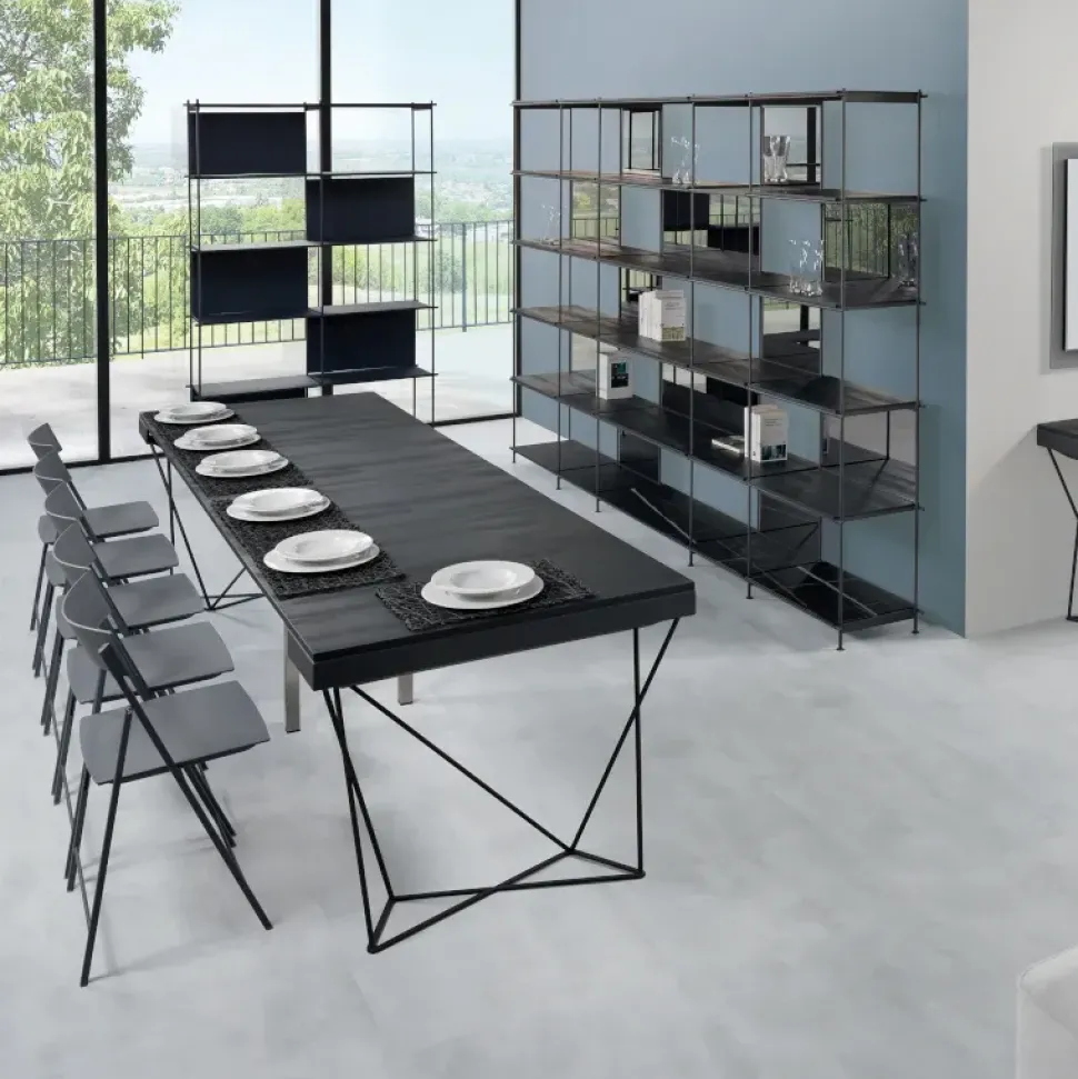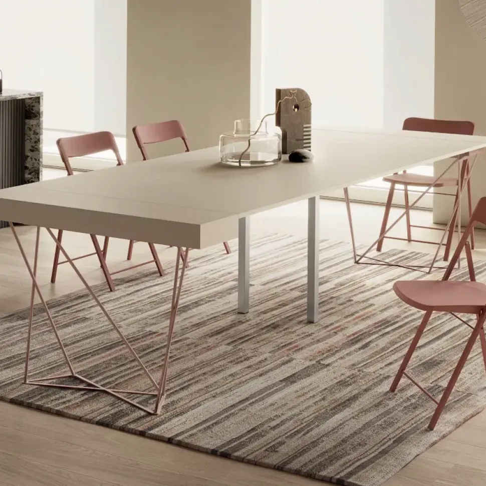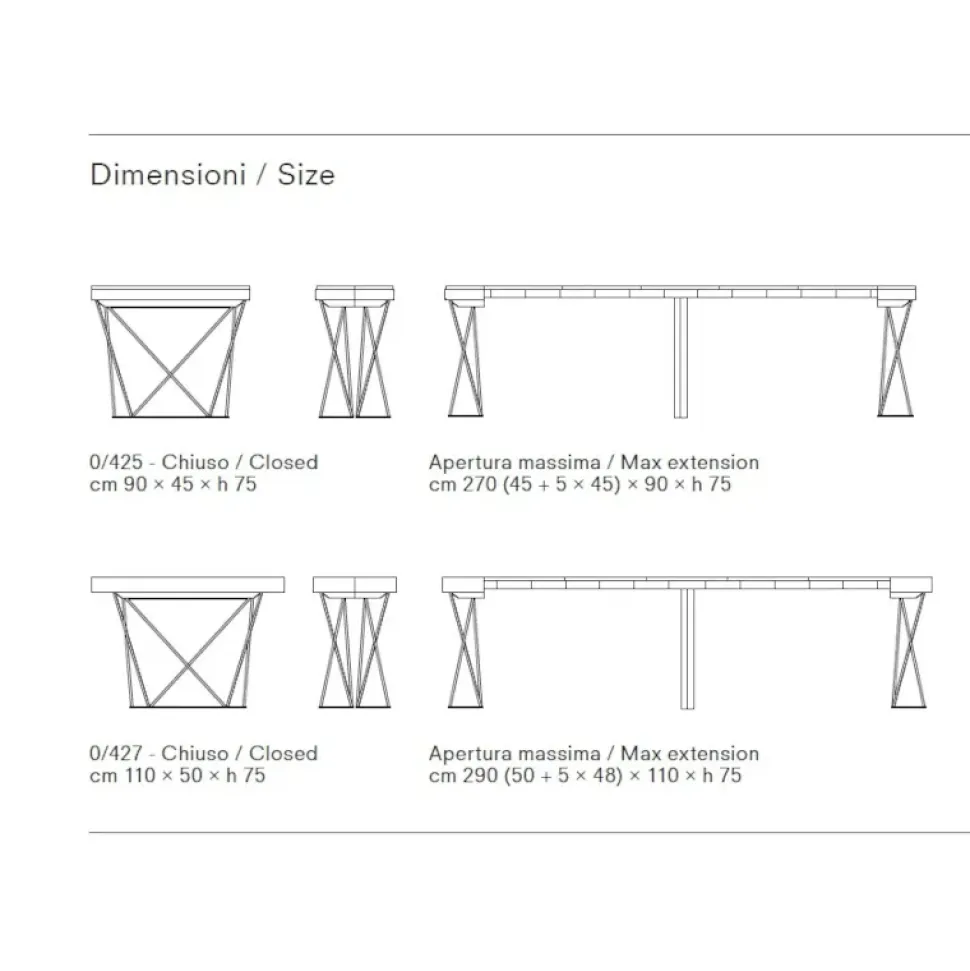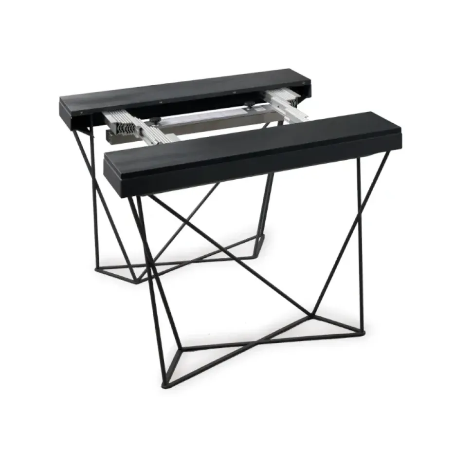 Il Tavolo-Consolle Excel di Pezzani è un complemento d’arredo pratico e raffinato. Nella versione da 110 cm, può estendersi fino a 290 cm grazie alle 5 allunghe da 48 cm. La struttura è in lamina d acciaio, con gambe in acciaio tondo pieno da 12 mm verniciato con finitura sablè. Il piano è in laminato ecologico di 18 mm di spessore. La guida estensibile in alluminio garantisce fluidità nel meccanismo, mentre le gambe pieghevoli di sostegno in acciaio inox offrono stabilità. È disponibile anche nella versione da 90 cm.