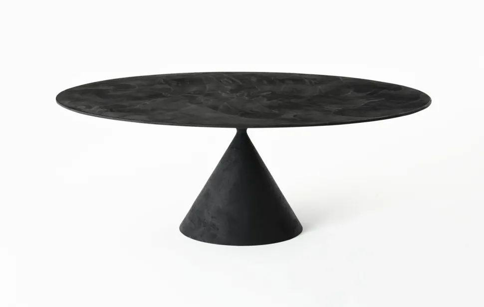 Il tavolo Clay di Desalto è uno scenografico tavolo-scultura che nasce dall’unione di due volumi. Il piano e il basamento sono infatti due coni in equilibrio uno sull’altro. Il basamento del tavolo in offerta è in poliuretano rigido mentre il piano è in MDF interamente rivestito tramite spatolatura manuale. Clay è di colore nero, la finitura è PIETRA LAVICA, con dimensione cm 160 accoglie circa 7 commensali.
