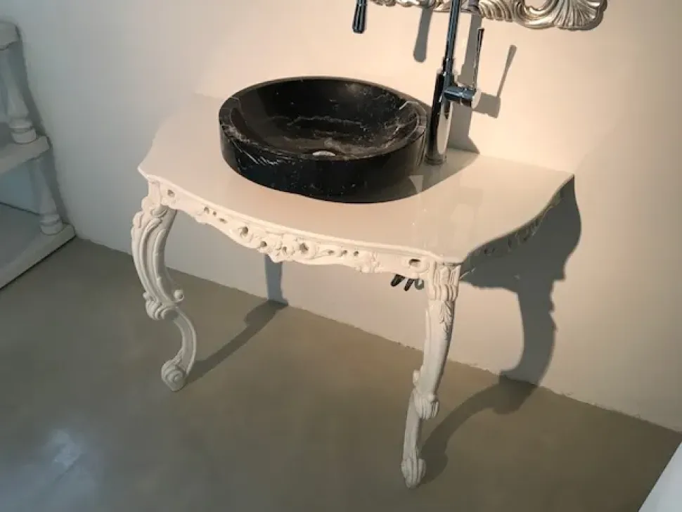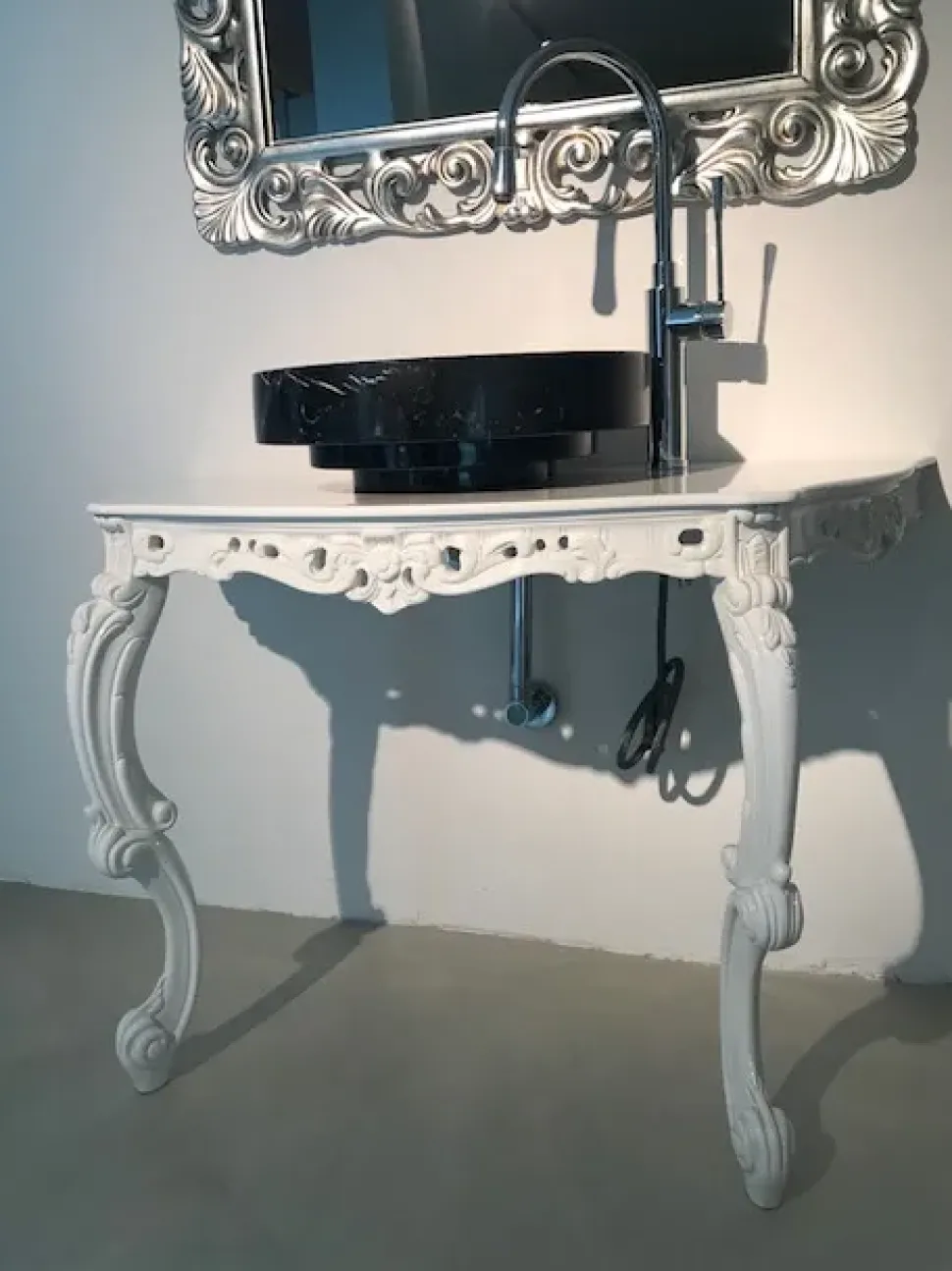 - Di che materiali è fatto il tavolo Well glam?Il tavolo presenta una struttura laccata bianco lucido con un lavabo in pregiato marmo nero marquigna, unendo eleganza e funzionalità.