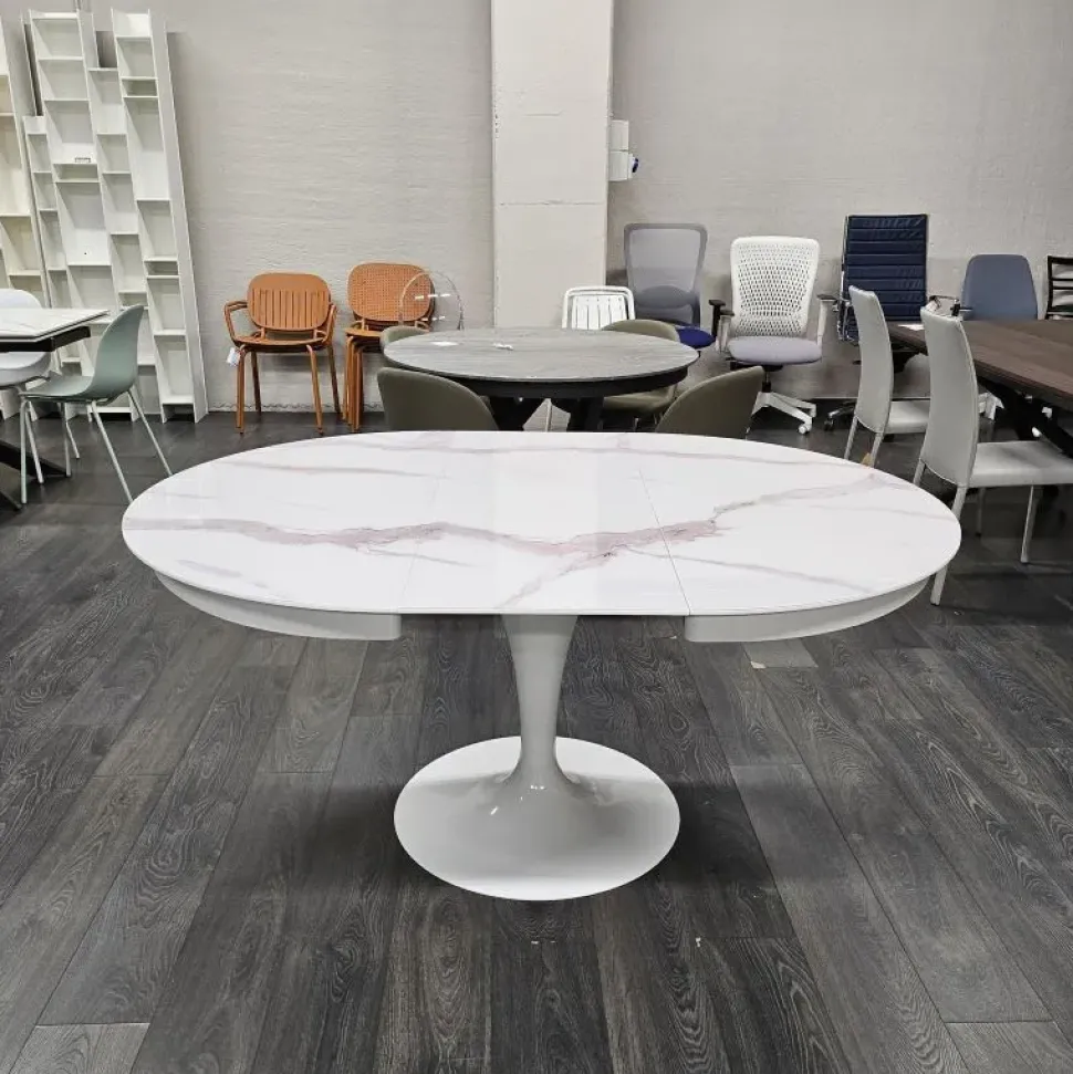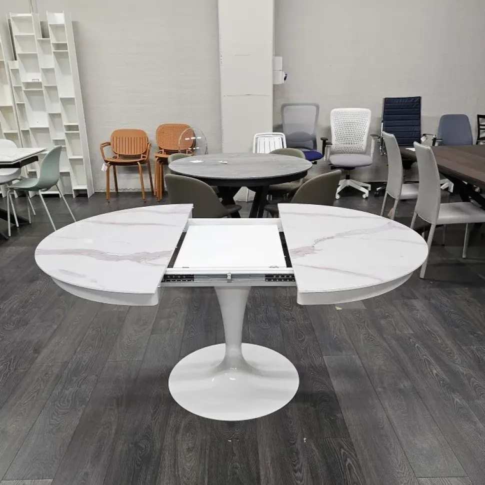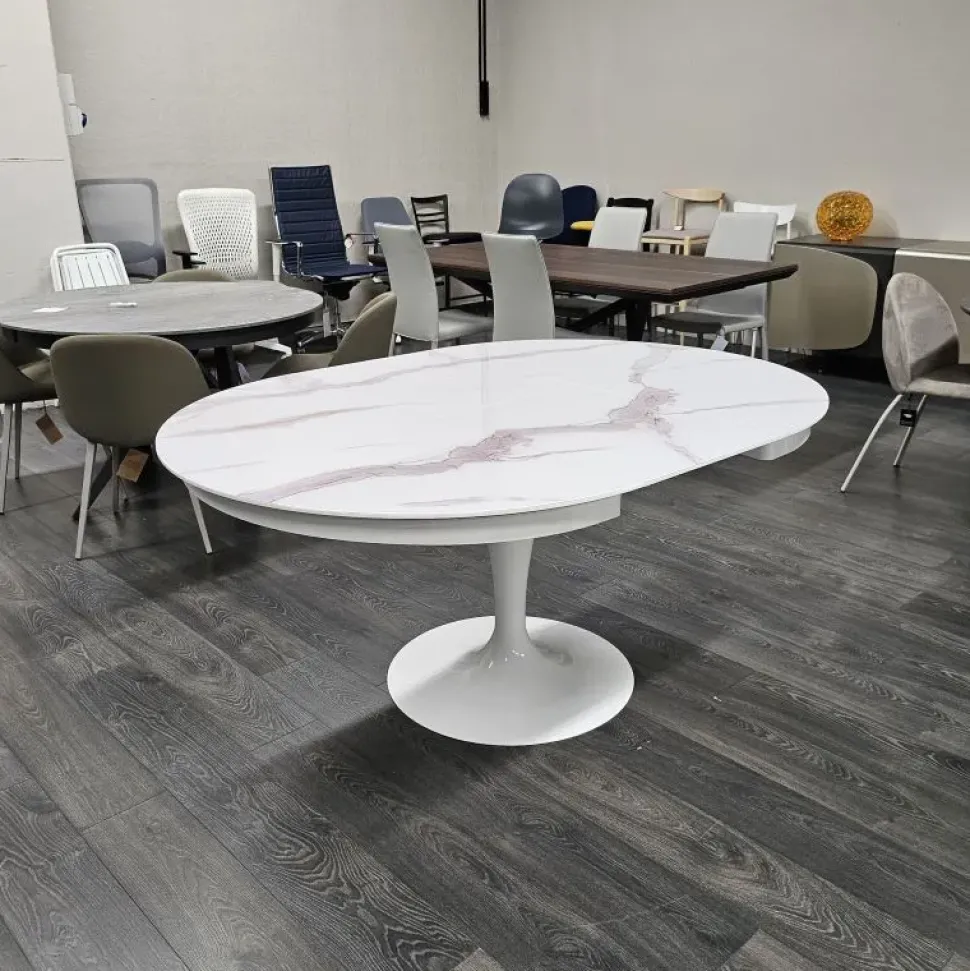 Da Pozzoli Arredamenti è in promozione il tavolo rotondo allungabile Eclipse di Ozzio Italia, un’icona di design che unisce eleganza e funzionalità. Questo tavolo si distingue per il suo basamento centrale in metallo bianco, dalla linea moderna e scultorea, che dona stabilità e leggerezza visiva.