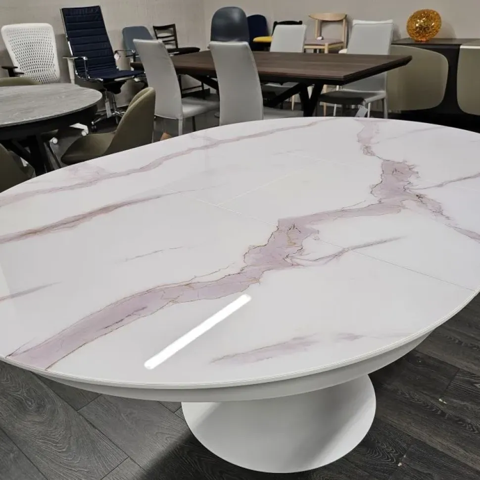 Il piano è realizzato in raffinato cristallo effetto marmo, impreziosito da delicate venature tendenti al rosa, che creano un effetto sofisticato e contemporaneo, perfetto per arricchire qualsiasi ambiente. Nella sua configurazione chiusa, Eclipse ha un diametro di 120 cm, ideale per spazi più raccolti e intimi. Grazie a un pratico e innovativo meccanismo di allungamento, il piano si trasforma rapidamente in una superficie rettangolare da 120 x 160 cm, pronta ad accogliere ospiti per cene e momenti conviviali.