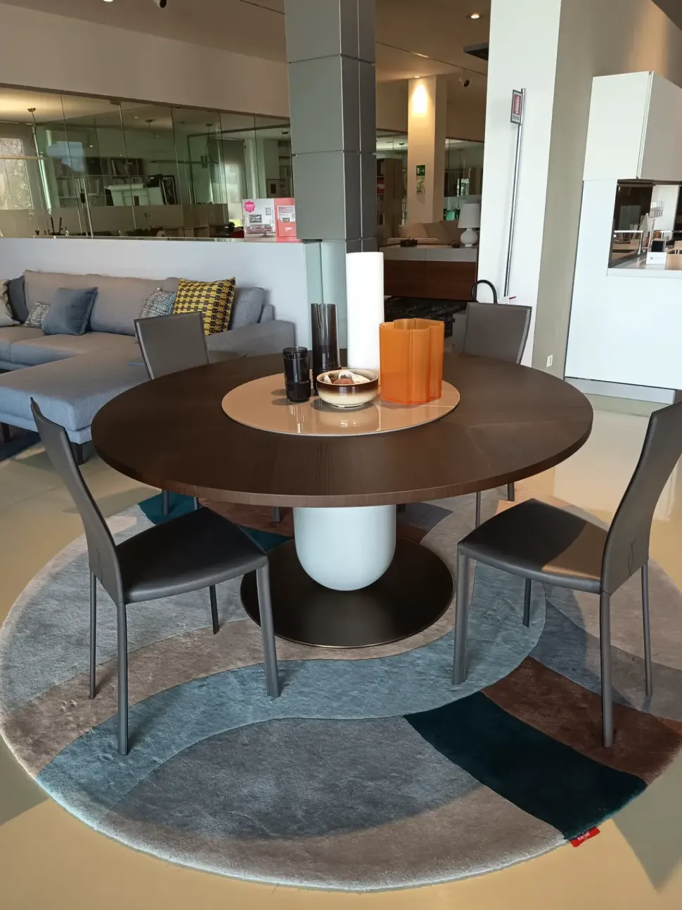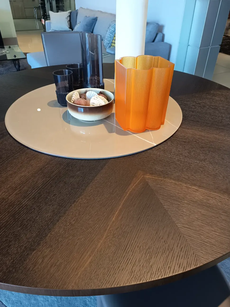 Tavolo Pianca modello Ettore versione tonda diametro 160cm. Con piatto girevole centrale, versione rovere Borgogna.