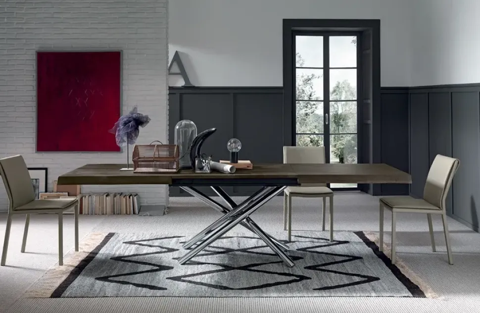 Tavolo allungabile Fahrenheit 160 di Altacom. Design originale, moderno, versatile. Fahrenheit si esprime attraverso la sua inconfondibile struttura a intreccio in metallo e le sue linee innovative. Il piano in nobilitato ha un alto spessore di 8 cm, elemento caratterizzante di questo tavolo che esalterà l’arredo della vostra casa per la sua forma scultorea e contemporanea. Fahrenheit si staglia con un elemento vivo del vostro spazio abitativo. L’offerta si intende per la versione con piano in nobilitato e base verniciata con due prolunghe interne. Sono disponibili esclusivamente su richiesta altre finiture. Dimensioni: l. 210-260 cm; p. 90 cm; l. base 160 cm; h. 75 cm.
