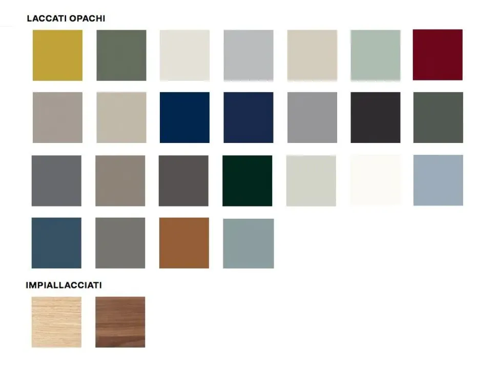 – Finiture Piano: Legno Noce Canaletto o Rovere Chiaro / Laccato Opaco in oltre 30 colori.