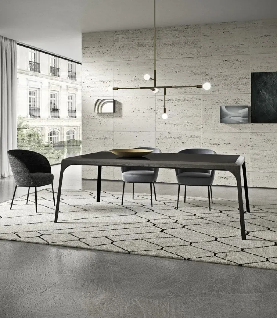Il disegno della gamba distingue questo tavolo, richiamando il passo di danza di una ballerina che si alza sulla punta del piede. La struttura è in essenza mentre il top può essere anche in vetro o ceramica. L’interno della gamba è disponibile anche con finitura laccata.