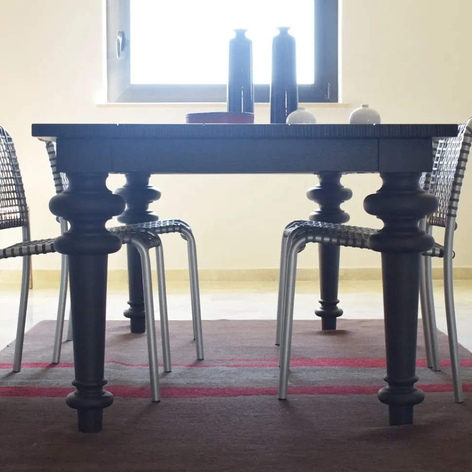 Una struttura a quattro gambe ultima la resa estetica del tavolo Rettangolare qui visibile, che si confermerà così presenza caratterizzante del soggiorno o della zona cucina dove è collocato, grazie alla sua figura dall’estetica raffinata.