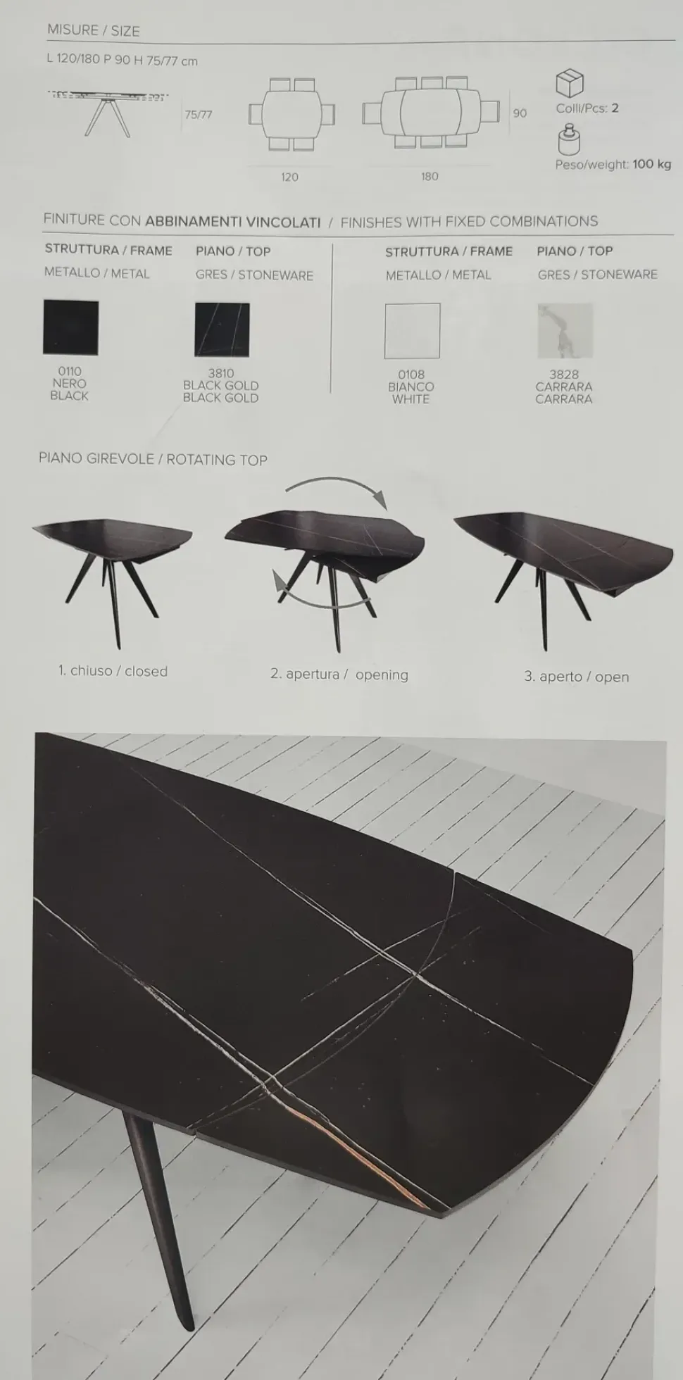TAVOLO CAPONORD 120X90ALLUNGABILE GIREVOLE A 180X90 CON PIANO IN GRES PORCELLANATO BLACK GOLD CON BASAMENTO NERO E BIANCO CARRARA CON BASAMENTO BIANCO