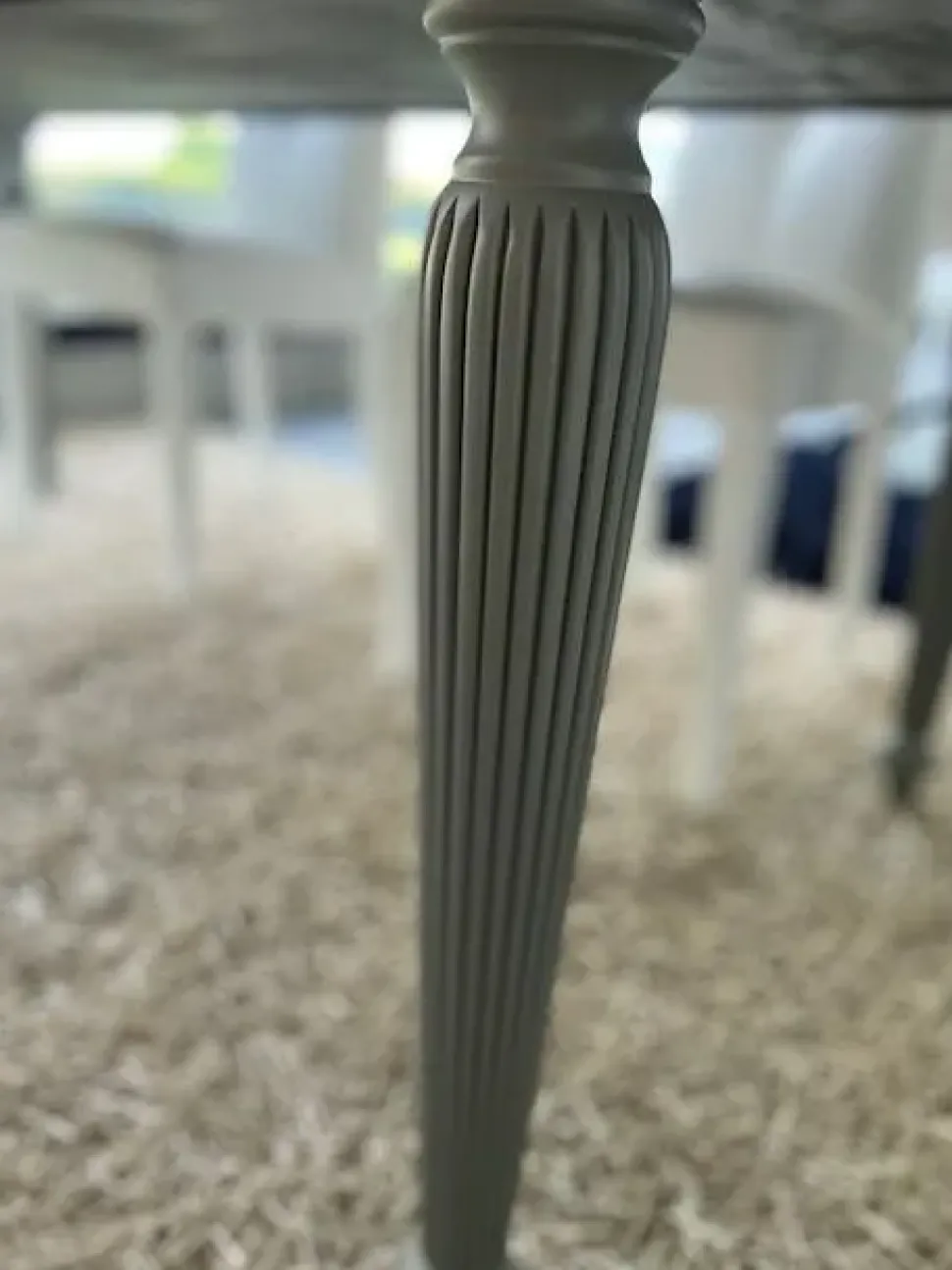 La finitura è bicolore , laccato opaco color grigio per la base e noce antiquariato per il piano .
