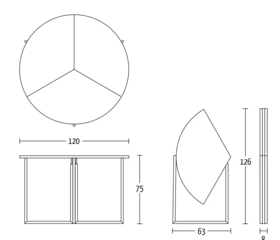 Tavolo Icaro di Altacom. Icaro è un tavolo tondo pieghevole dotato di grande praticità e versatilità. Icaro si piega come un origami, ideale come soluzione salva-spazio per la casa o per l’ufficio. Una soluzione dinamica, originale e creativa per chi ama adattare il proprio spazio abitativo in base alle necessità del momento. Il tavolo ha un’apertura a compasso, con base in metallo e piano in nobilitato. Icaro ha una profondità minima di 8 cm da chiuso e raggiunge un diametro di 120 cm quando il piano è aperto. Ideale da conservare chiuso in un piccolo spazio. L’offerta si intende per il piano in nobilitato con base verniciata. Disponibili altre finiture su richiesta. Misure da chiuso: l. 63 cm; p. 8 cm; h. 126 cm. Misure da aperto: l. 120 cm; h. 75 cm.