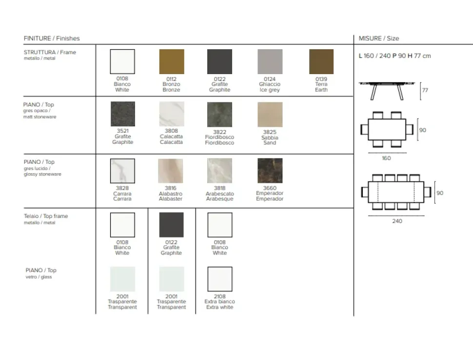 Tavolo allungabile in metallo con gambe in metallo verniciato, piano ed allunghe laterali in gres porcellanato o vetro temperato.