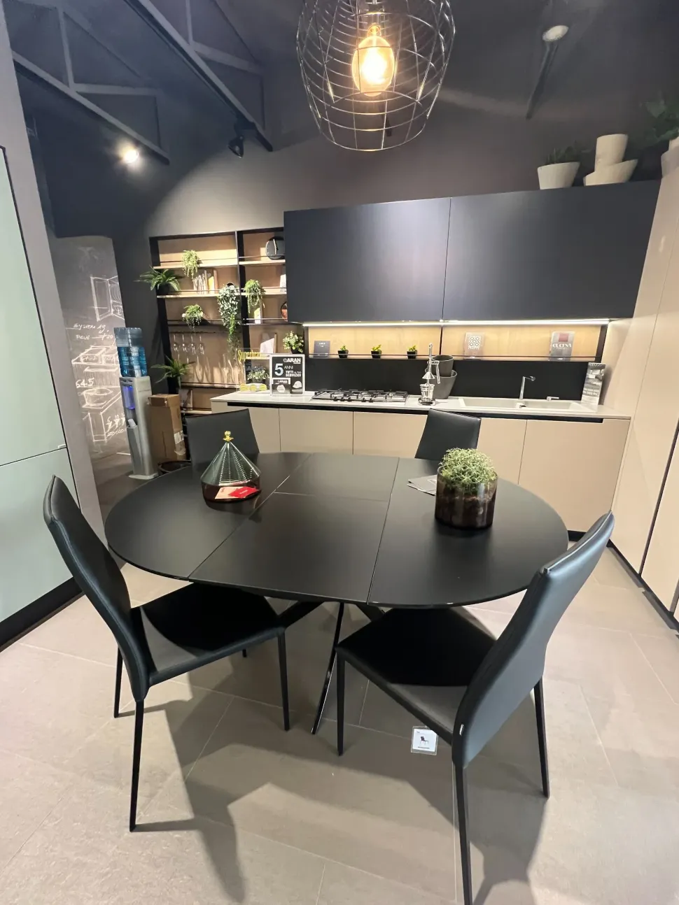 TAVOLO ROTONDO ALLUNGABILE CON VETRO VELVET ANTIGRAFFIO NERO OPACO E STRUTTURA IN NERO PROFONDO LUCIDO.