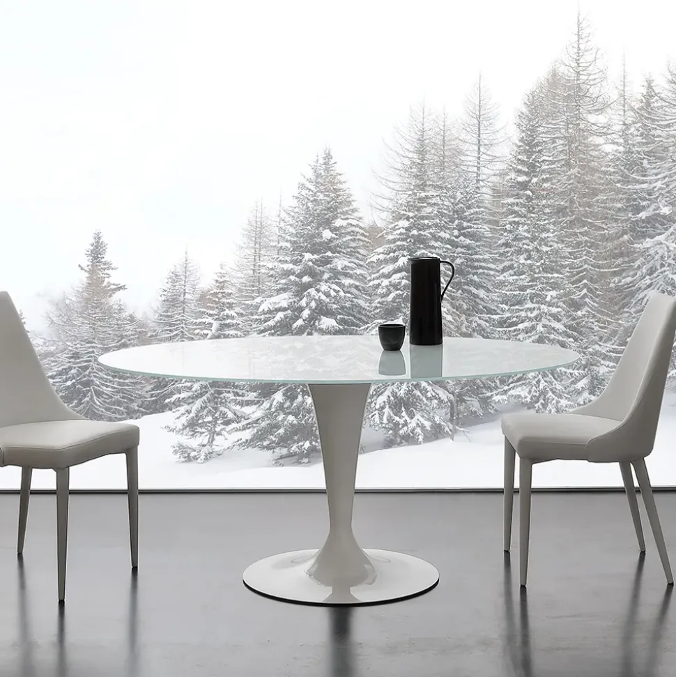 Bramante è un tavolo con la base in acciaio verniciata bianca e il piano ellittico in vetro temperato extrawhite.