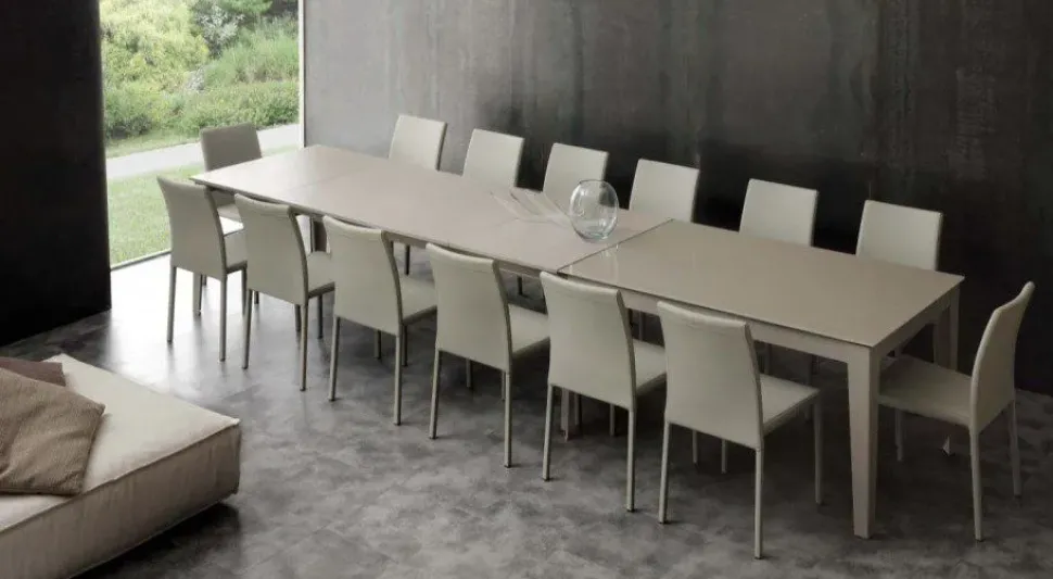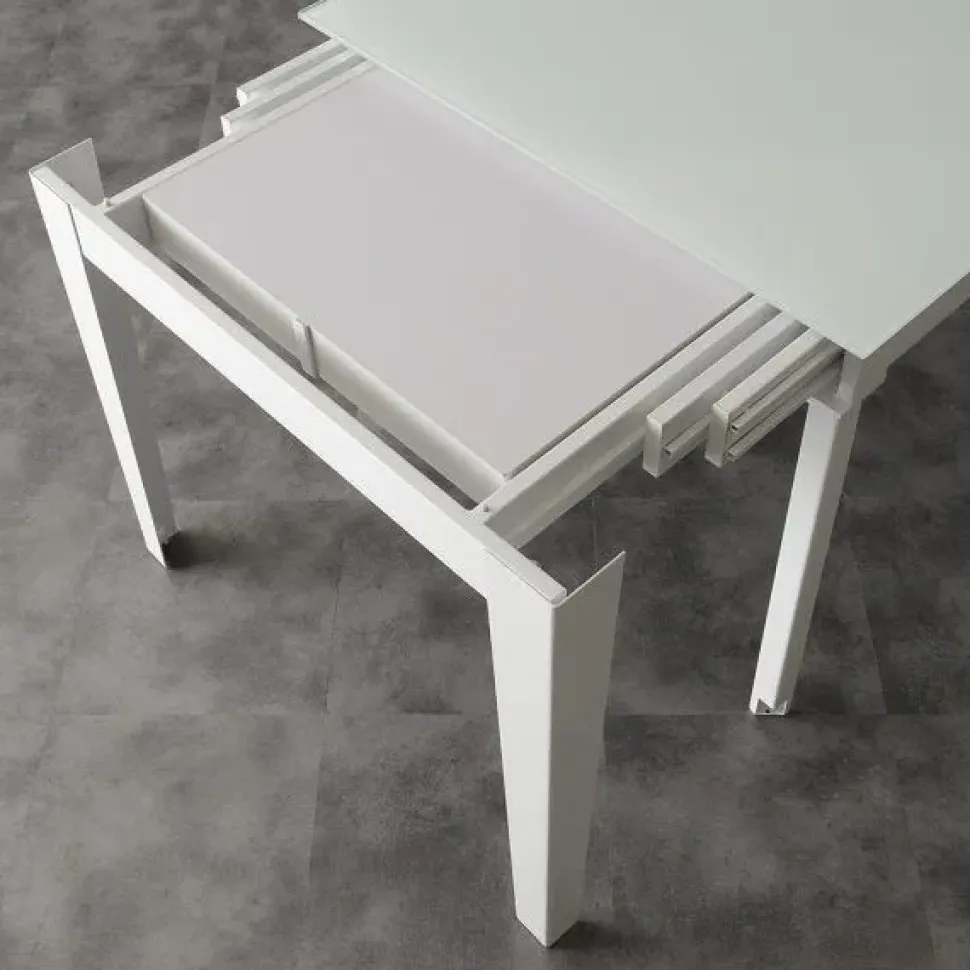 Il piano è in vetro temperato, ed è disponibile in due versioni: tortora chiaro lucido con struttura in tinta e extrawhite lucido con struttura bianca. La versione in promozione è con piano in tortora chiaro lucido e struttura in tinta. Per facilitare l’apertura e il montaggio del piano, i piedi del tavolo sono dotati di mini rotelle che permettono uno spostamento facile delle due estremità. Long Way è disponibile anche con piano in ceramica.