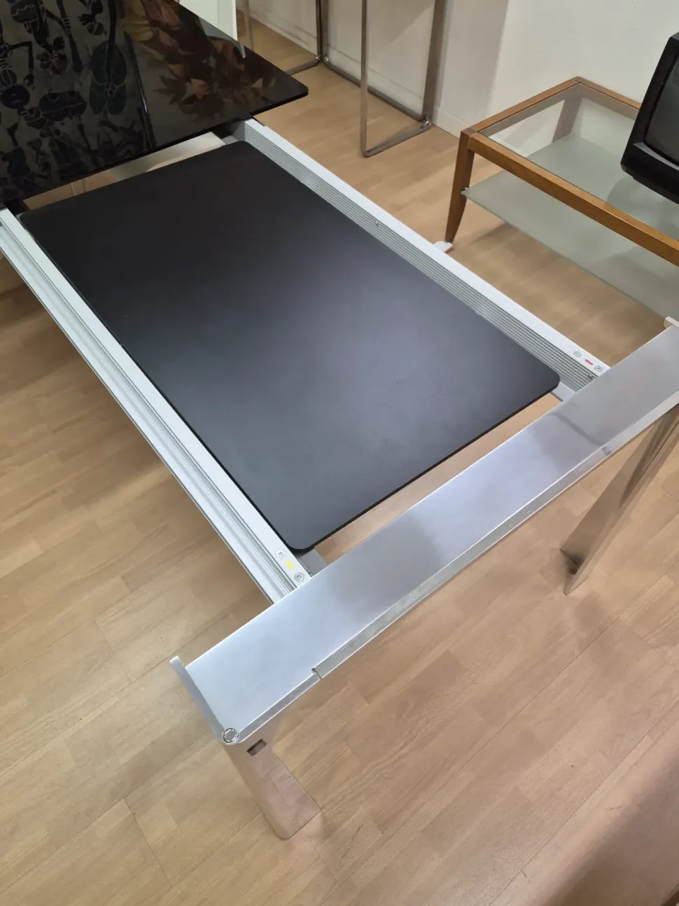 Tavolo allungabile rettangolare con piano in cristallo e gamba affusolata.