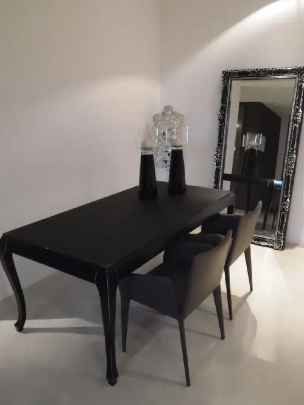 Descrizione: Tavolo dal gusto Vintage rivisto e modernizzato, struttura laccato opaco nero con top vetro opaco tinta su tinta, che rende il tavolo più resistente e pratico per pulizia e resistenza ai graffi.