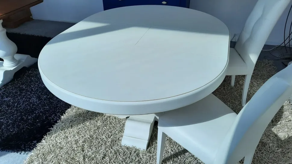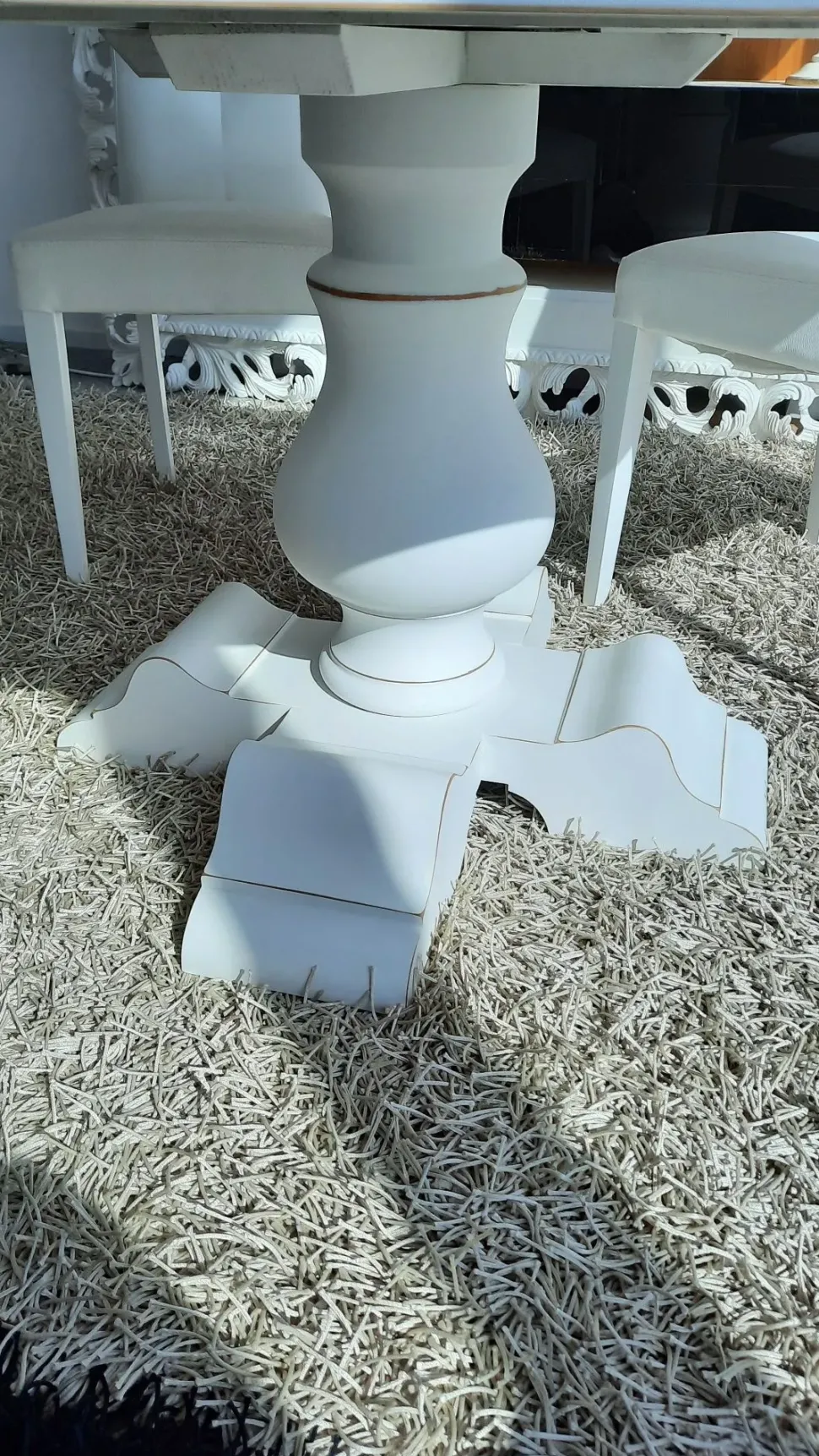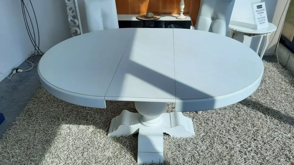 Tavolo Artigianale Allungabile modello Amalfi in legno massiccio con gambone centrale, lavorato interamente a mano , colore bianco opaco con bordi leggermente consumati , disponibile anche in colore personalizzato , adatto per qualsiasi ambiente , misure diametro 120(+1 allunga da 40 cm) x78H