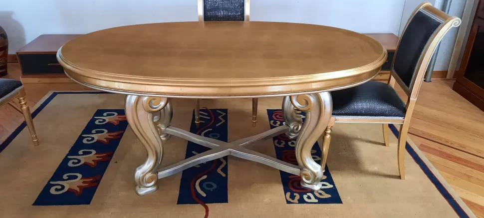 Tavolo Ovale massiccio con gambone intagliato a mano , finitura foglia oro e foglia argento , articolo realizzato interamente a mano ,pezzo unico.