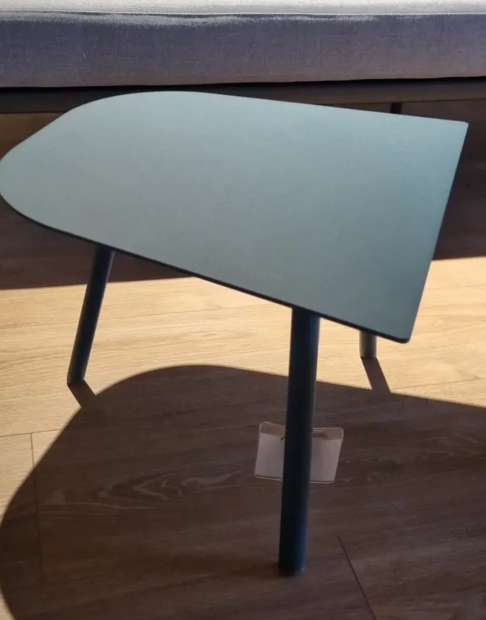 Tavolino Fast in alluminio verniciato blu petrolio con un lato squadrato ed un lato tondeggiante.