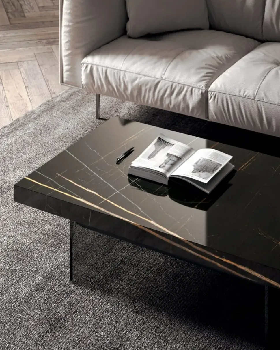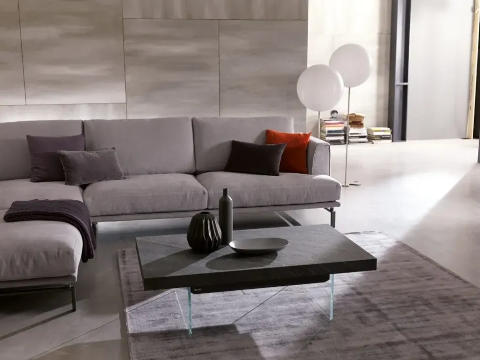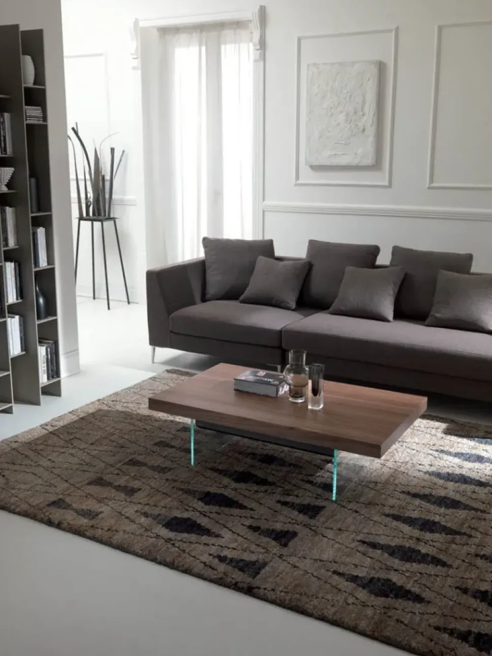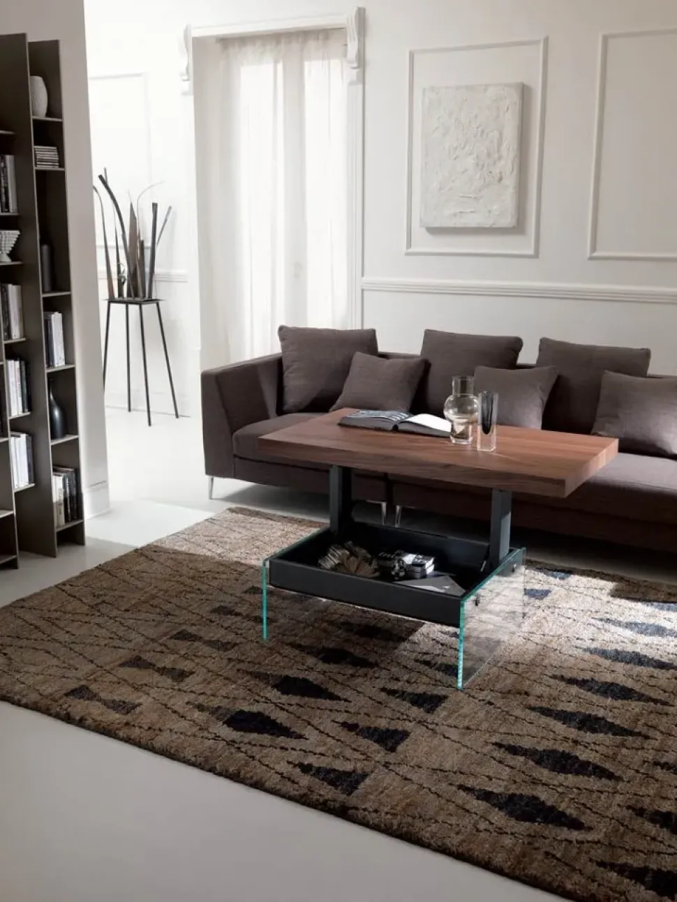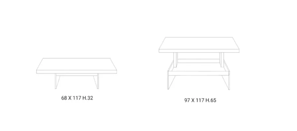 Tavolino trasformabile 68/9797×117 a 2 altezze (cm 32 o cm 65), struttura in metallo, piano disponibile in rovere wild, noce canaletto, rovere vecchio, marble glass opaco o lucido, gambe in cristallo e meccanismo di sollevamento a gas auto-frenante.