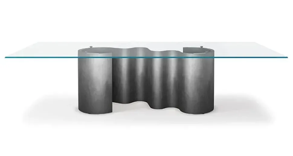 Tavolo con base in acciaio verniciato goffrato titanio, bronzo, Oxybrass o Oxygrey. Piano in cristallo 15mm trasparente, trasparente extrachiaro o trasparente extrachiaro con bordi bisellati inversi. Dimensioni L 240 P 120 H74cm.